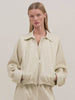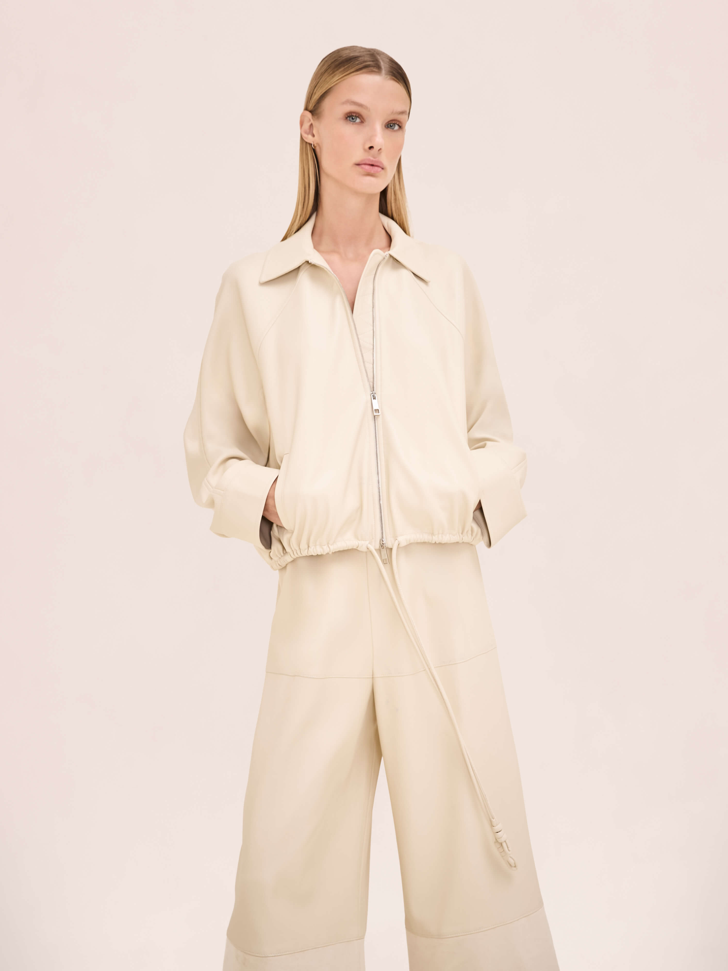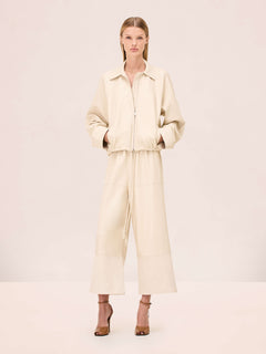 The Channing Jacket is a relaxed zip-front style with a pointed collar, paired with the wide-leg Jacob Pant.