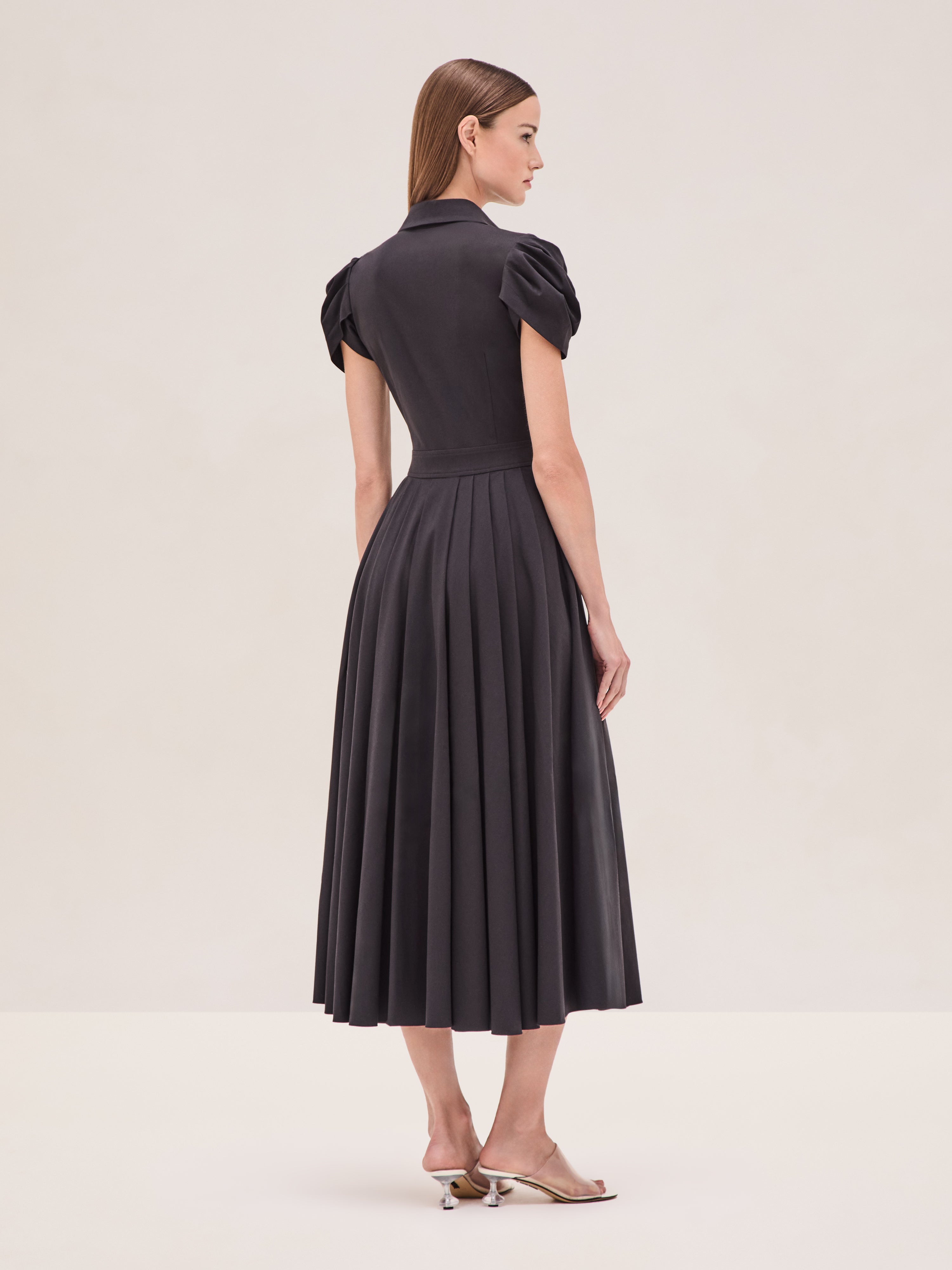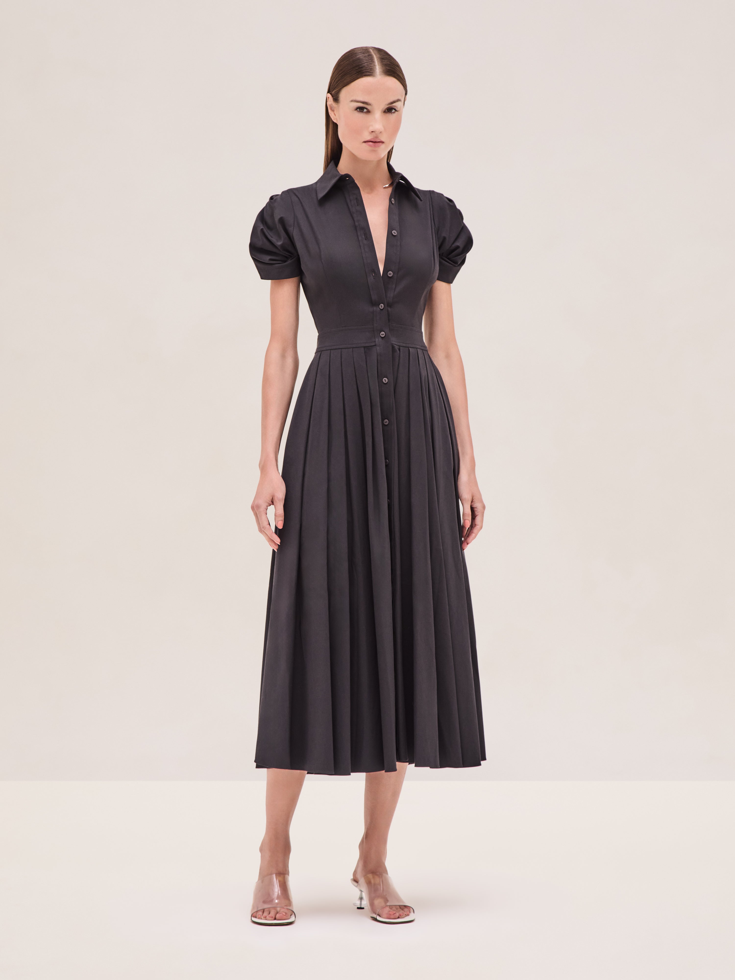 The Gyles Dress is a cotton poplin midi featuring a structured shirt collar, button-down front, and soft pleating.