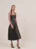 The Imena Dress is a halter-neck midi dress featuring a fitted bodice and front pleat detailing.