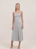 The Imena Dress is a halter-neck midi dress featuring a fitted bodice and front pleat detailing.