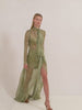 The Lexia Dress is a long sleeve maxi featuring a high neckline with scarf tie detail, a sheer overlay, and a gathered waist with a side slit.