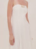 The Pearse Dress is a strapless A-line silhouette featuring a belted neckline detail.