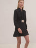 The Romina Dress is a long-sleeve mini dress featuring ruffle trim detailing, a pleated skirt, and a floral waist accent.