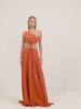 The Saint Lucia Dress is a floor-length gown featuring a one-shoulder silhouette and a gold chain cutout detail.
