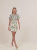 The Silva Dress is a short-sleeve mini dress featuring a structured silhouette and geometric print.