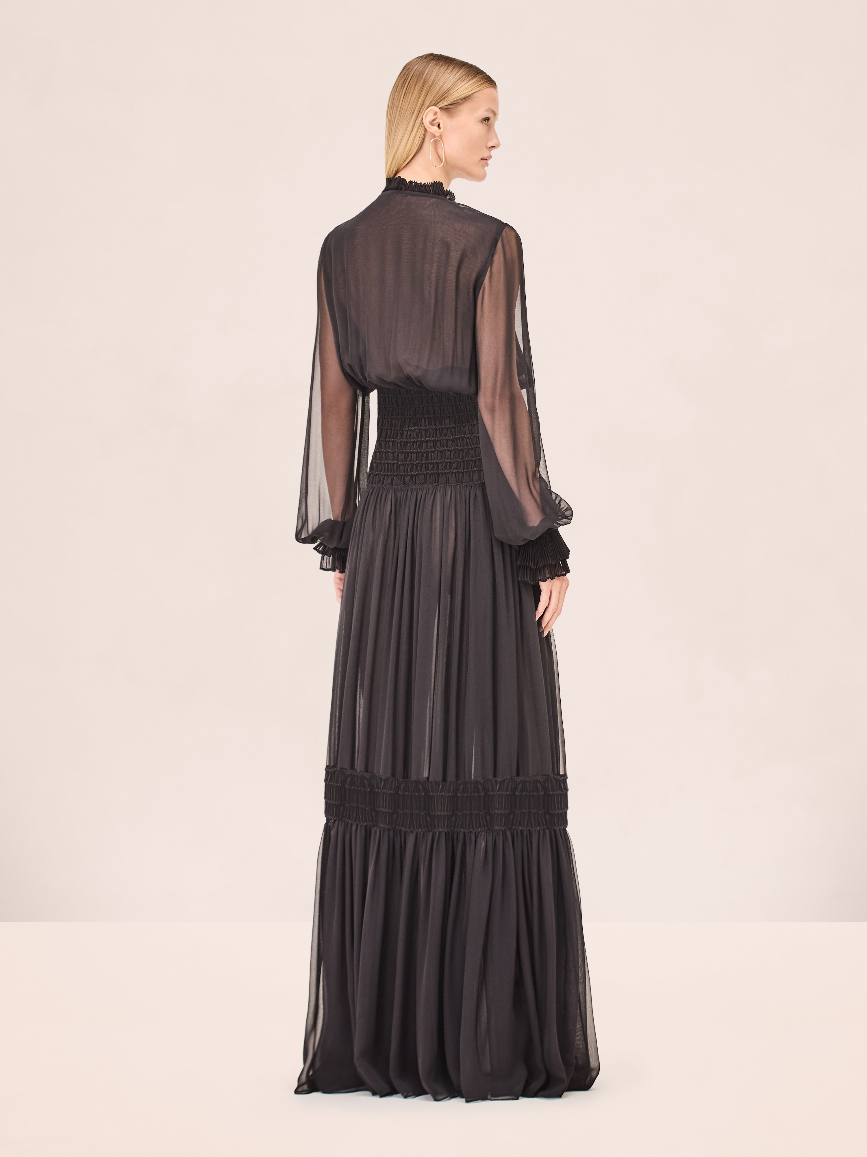 The Tabitha Dress is a long sleeve maxi silhouette featuring a sheer bodice, smocked waist, and ruffle trim neckline.