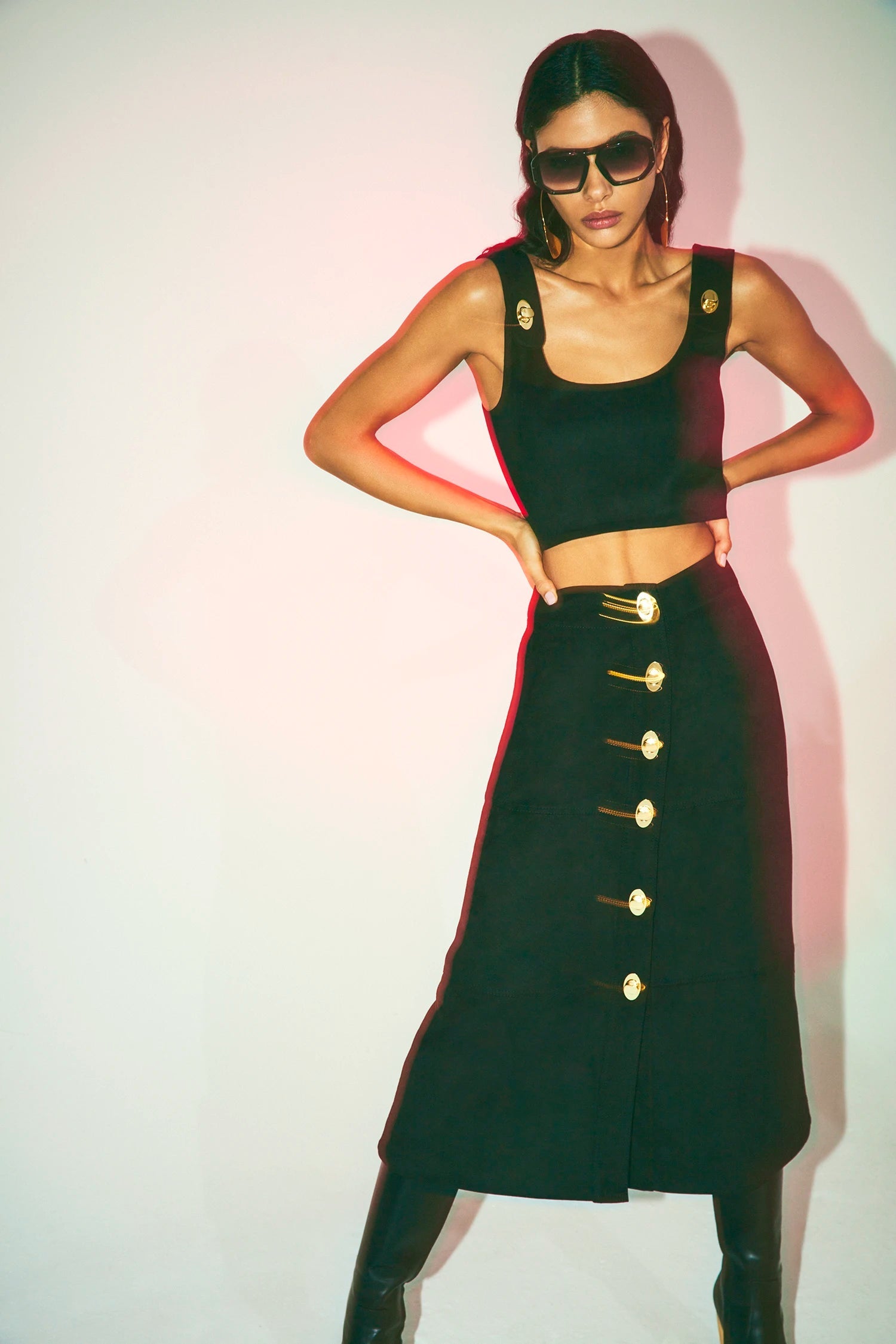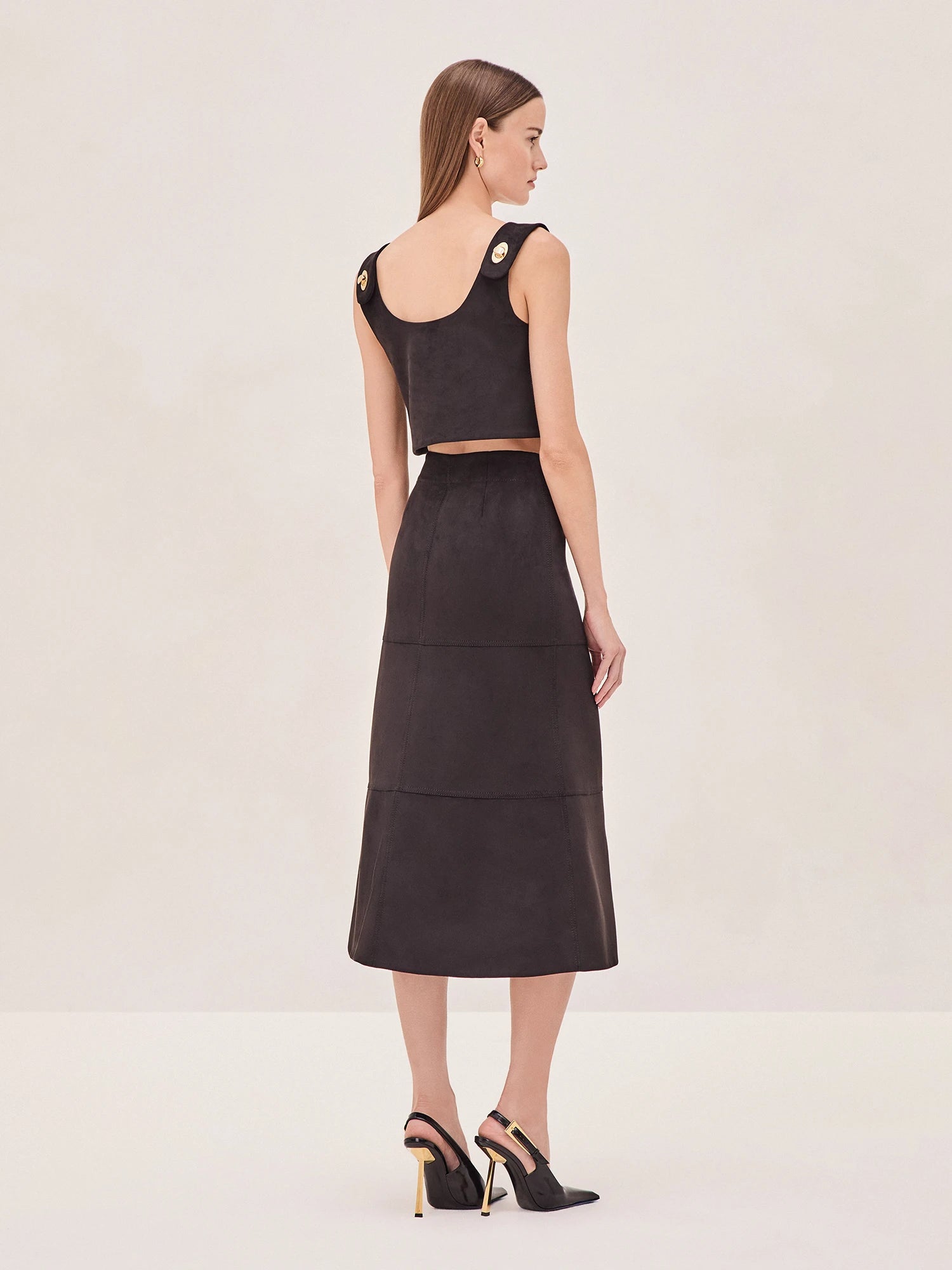 Upgrade your wardrobe with the Sinead Skirt - a high-waisted vegan suede beauty that boasts clean lines and bold gold buttons down the front. Designed to effortlessly elevate your look, this versatile skirt pairs perfectly with the Norie Top and can be easily mixed and matched with other pieces for a sleek and stylish day to night transition.