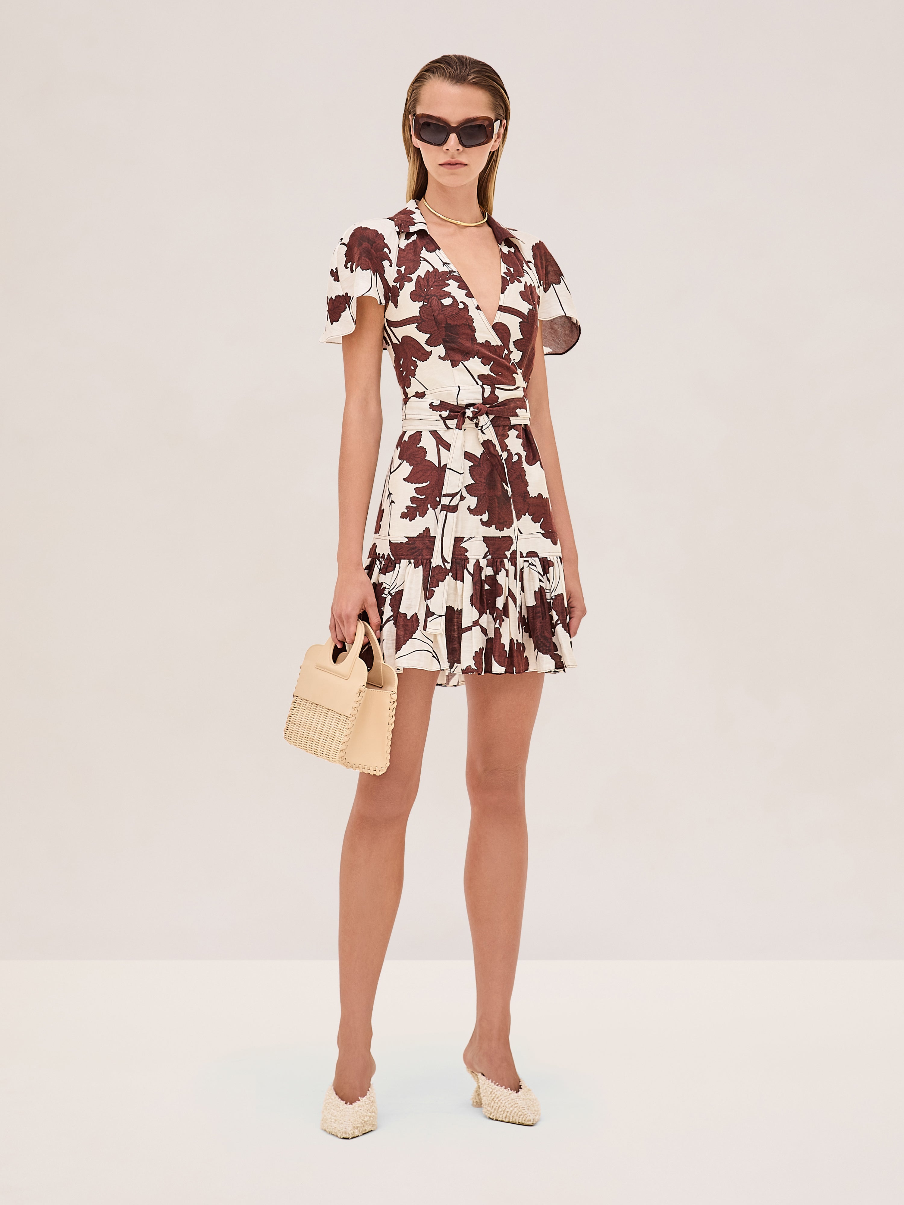 The Melba Dress features a flattering wrap-style silhouette, flutter sleeves, and a tiered mini skirt. The bold brown floral print adds a fresh, vibrant touch, while the adjustable tie waist ensures the perfect fit.