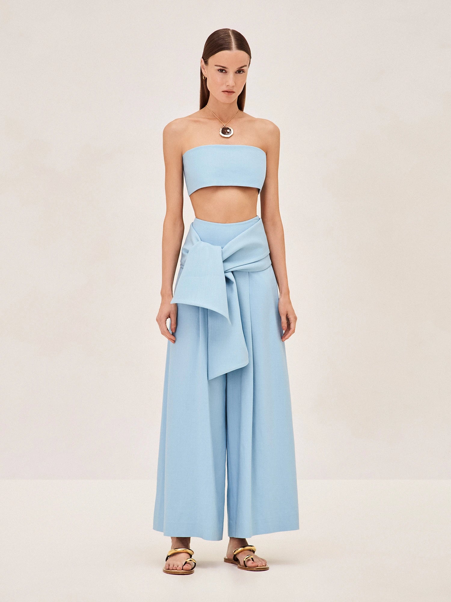 The sleek Brodi Pant features a high-waisted design, accentuated by a self-fastening sash belt, and flows gracefully to the floor with delicate pleats.