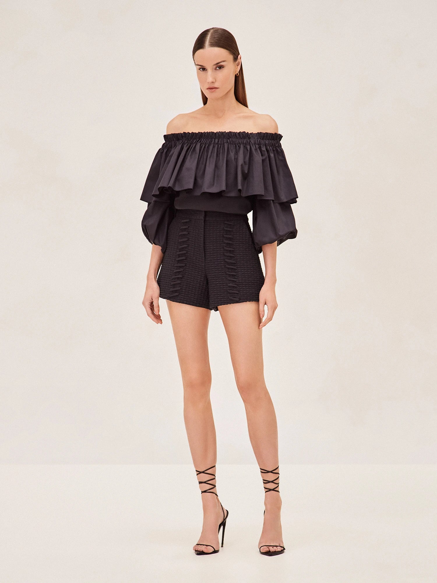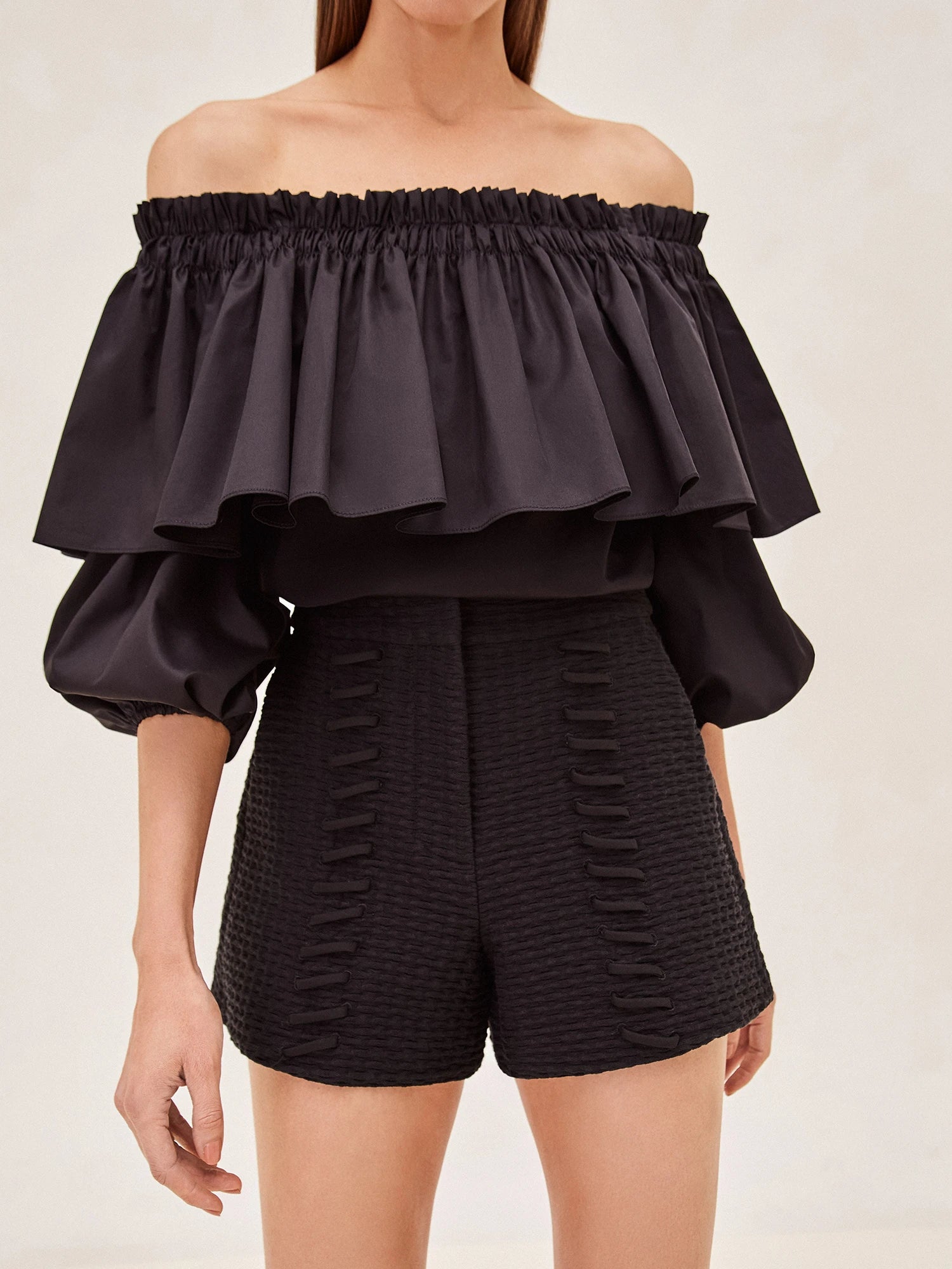 The Arosa Top adds luxury to your wardrobe with its elegant off-the-shoulder design, cascading ruffle detail, and relaxed fit. Perfect for days when you want to feel effortlessly chic.