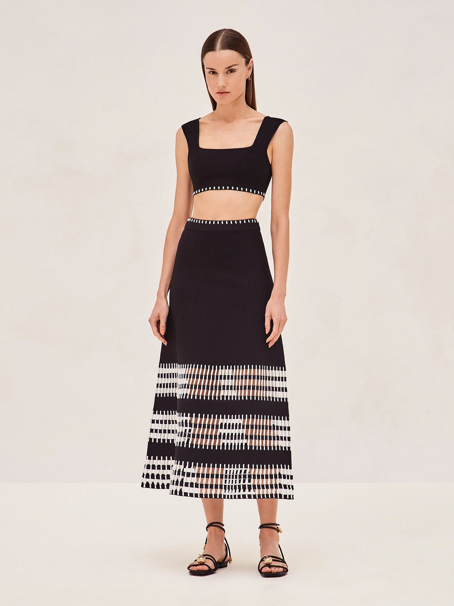 The Simone Skirt is a testament to innovative design, merging classic elegance with contemporary detail. Its intricate open-weave pattern towards the hem offers a glimpse of allure, while the solid upper maintains an air of sophisticated grace. For a captivating ensemble, pair it with the Kesa Top to create a seamless, coordinated look that's both modern and timeless.
