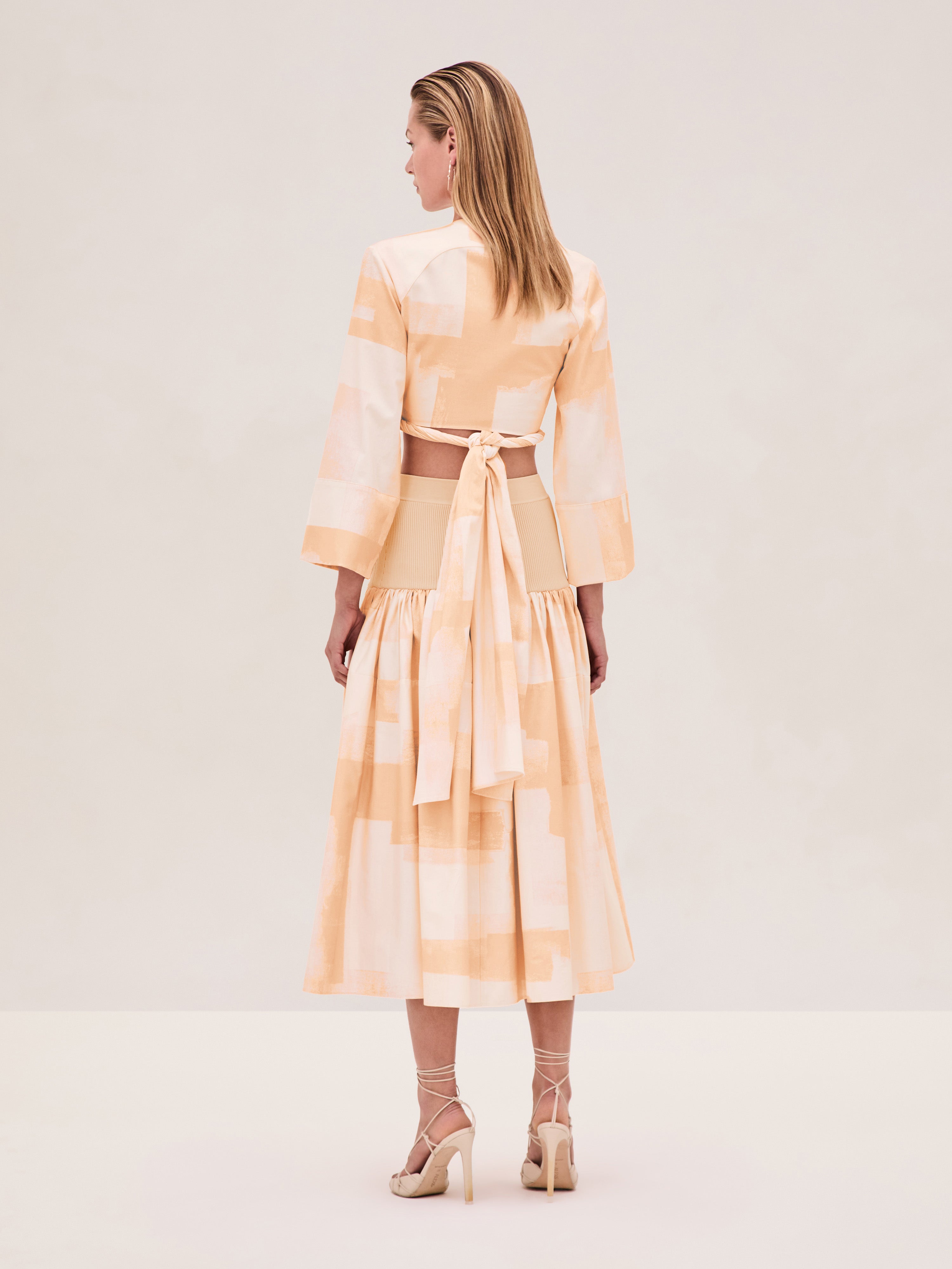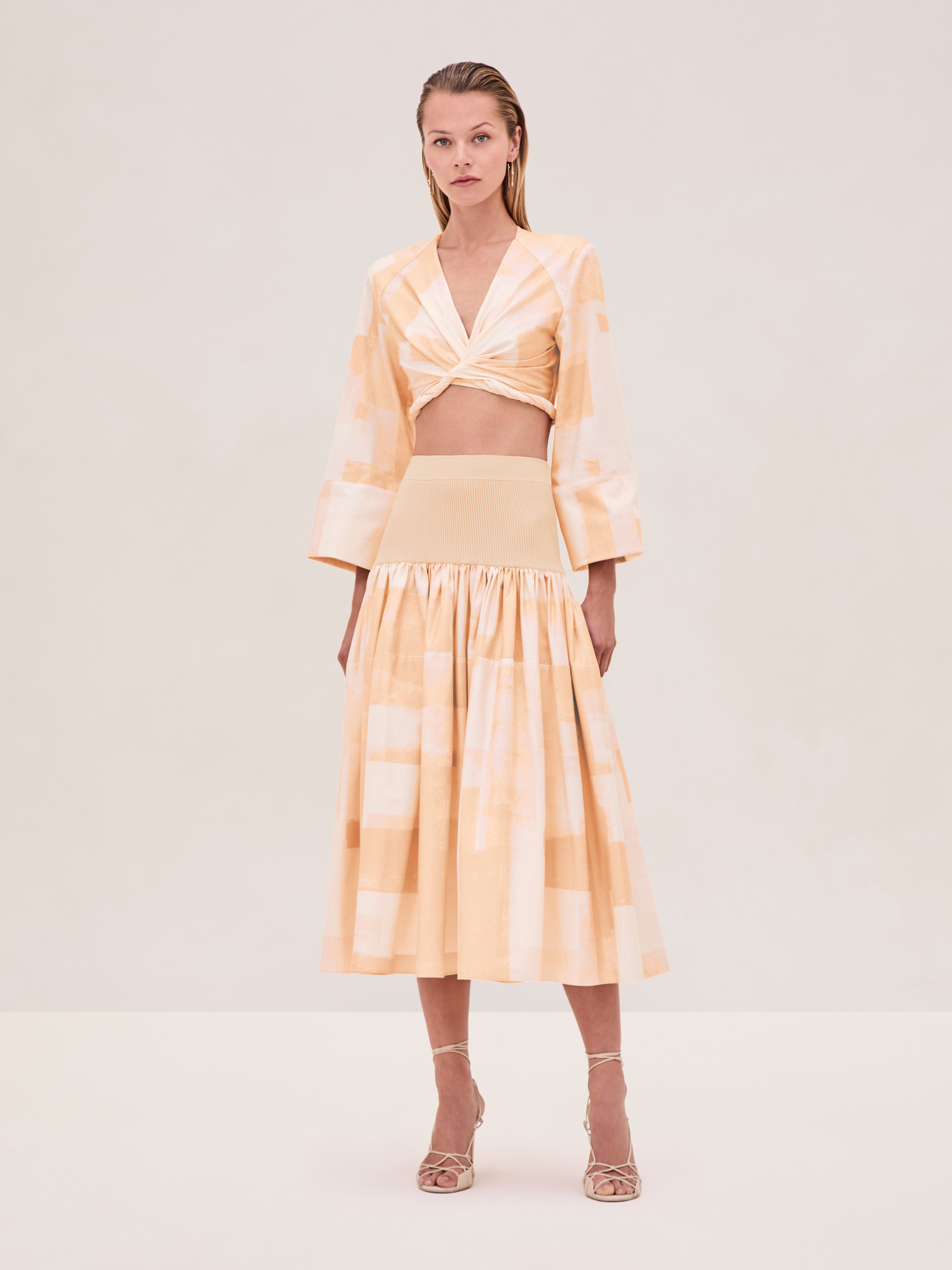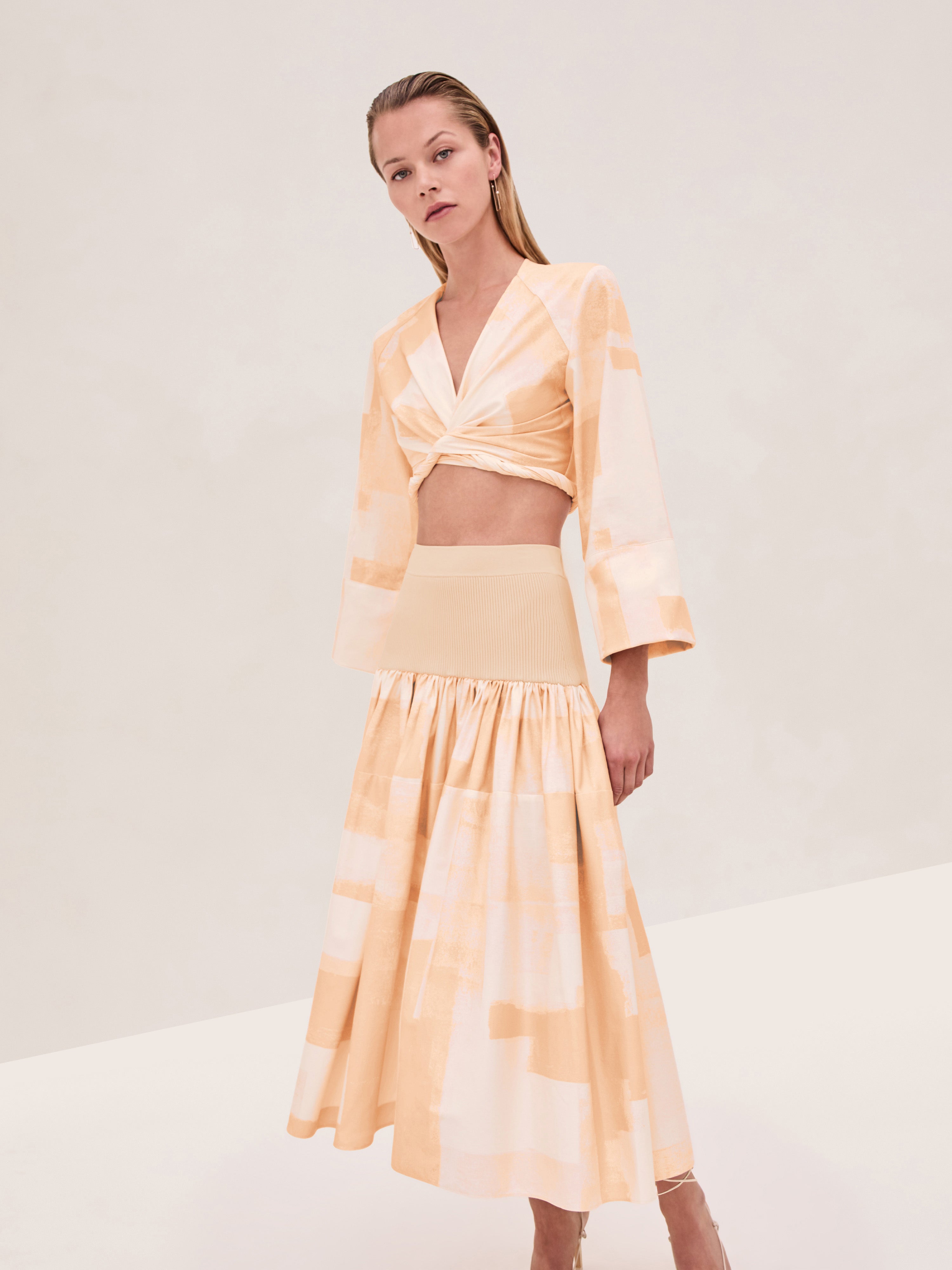 The Ansalm Top is a printed wrap top with voluminous cuffed sleeves, paired with the Arnette Skirt.