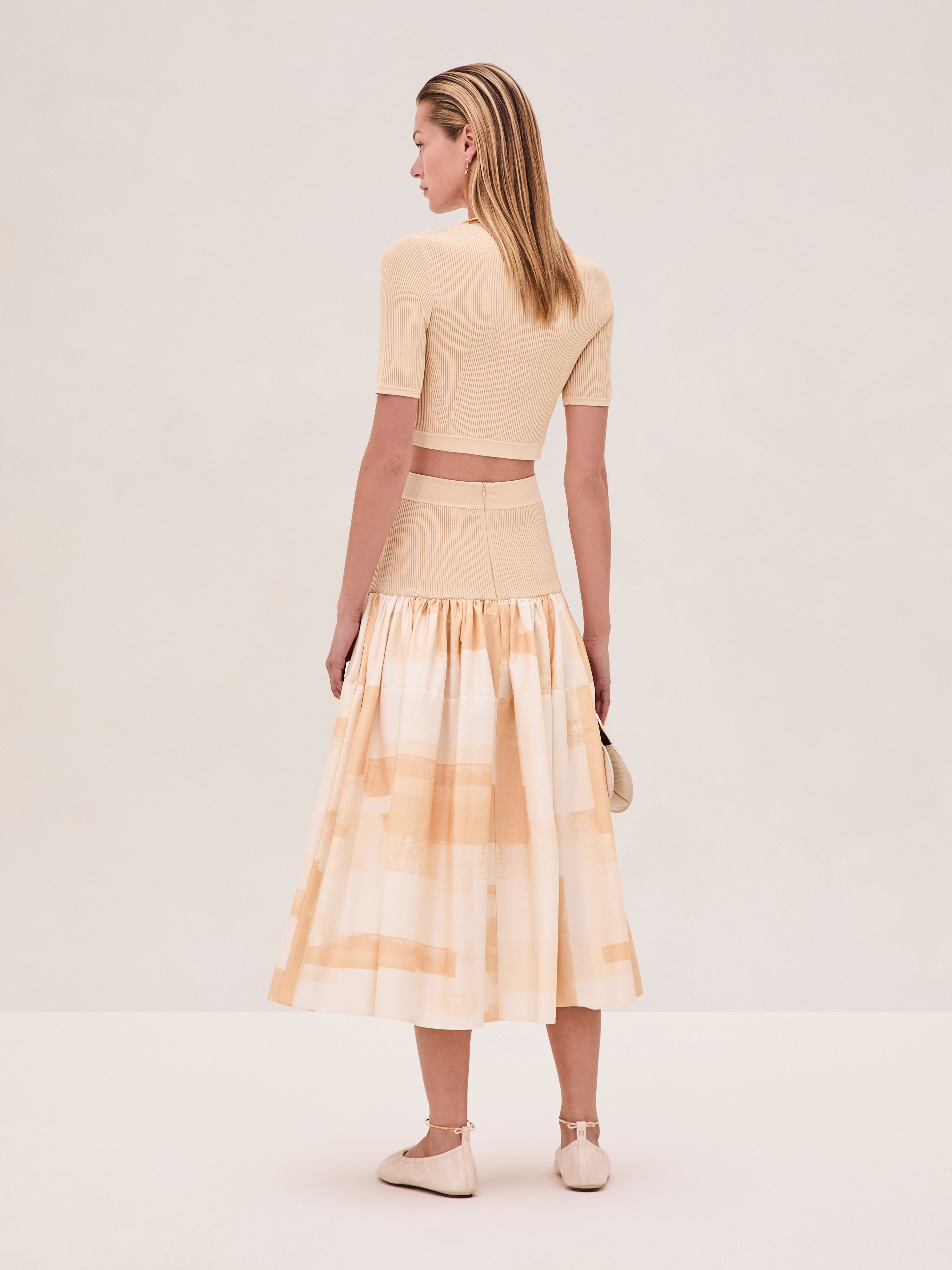 The Arenette Skirt is a flared skirt featuring a ribbed knit waistband and a brushstroke pattern, paired with the Aldeo Cardigan and Azito Top.