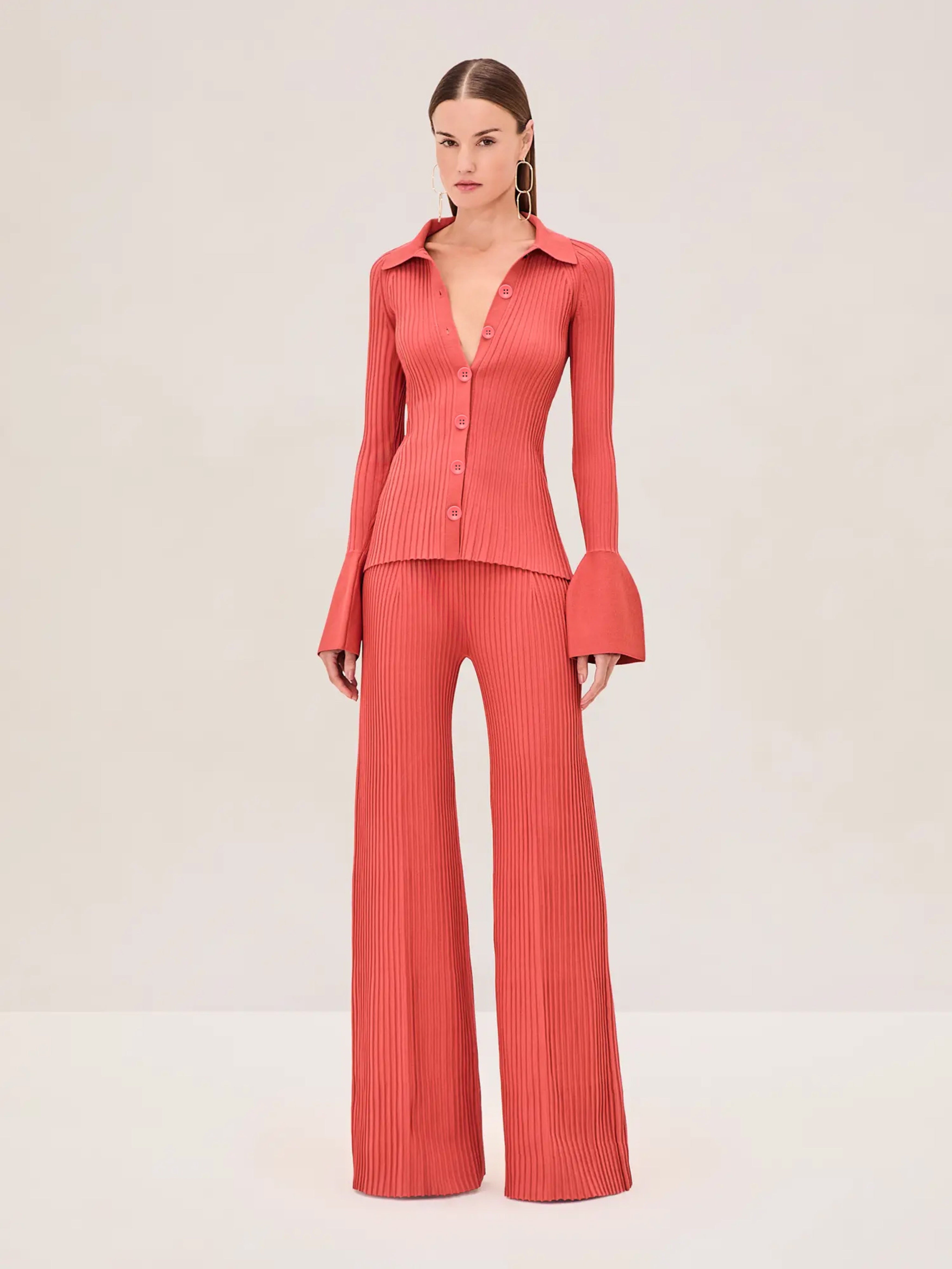 The Boda Pant is a ribbed knit flare pant with an elastic waistband, paired with the Olena Top.