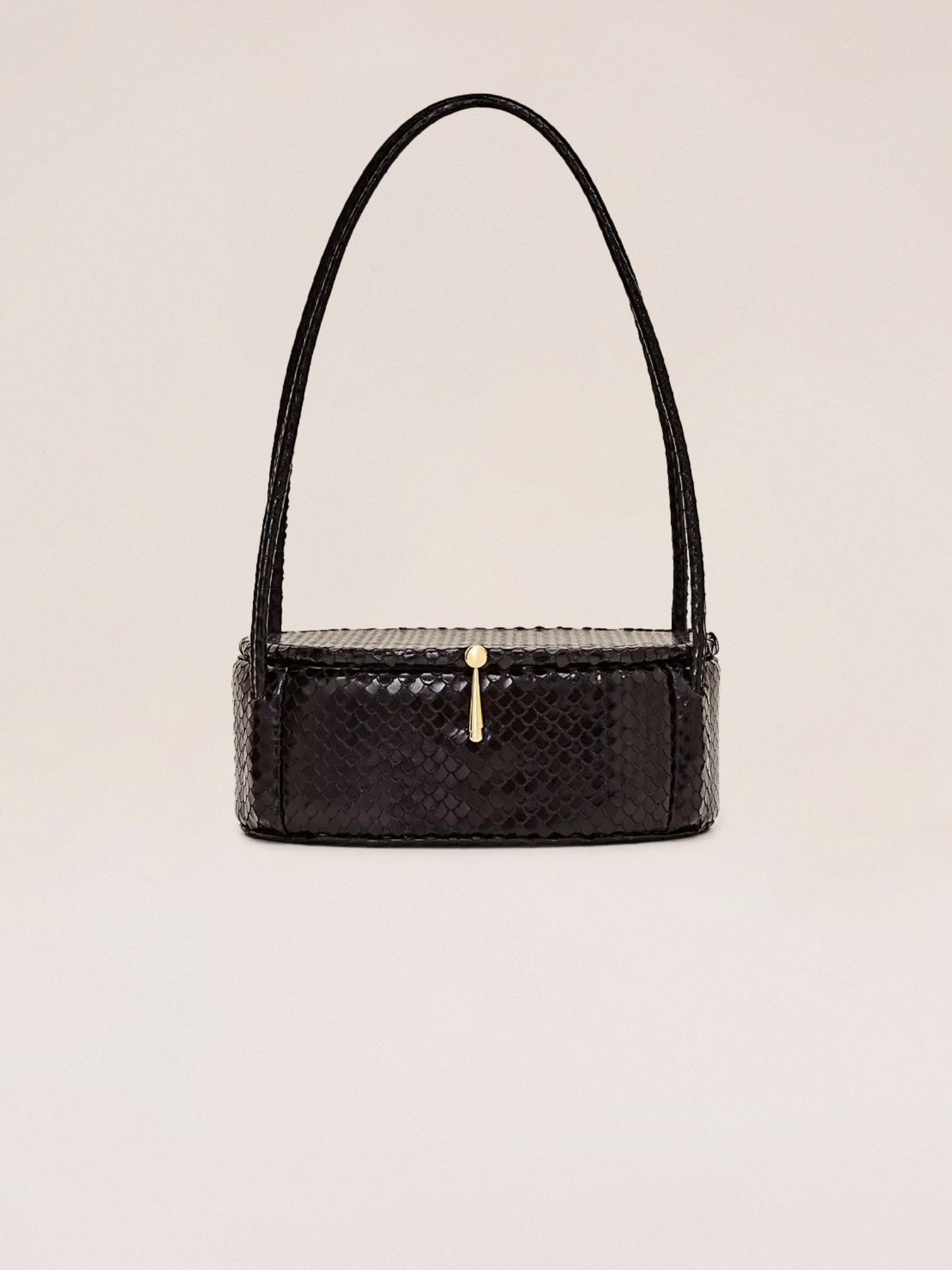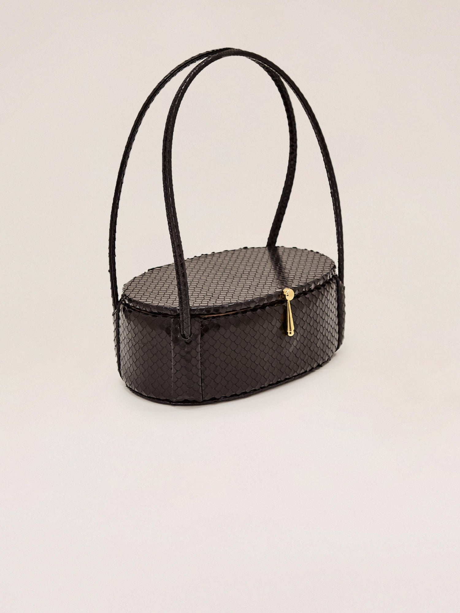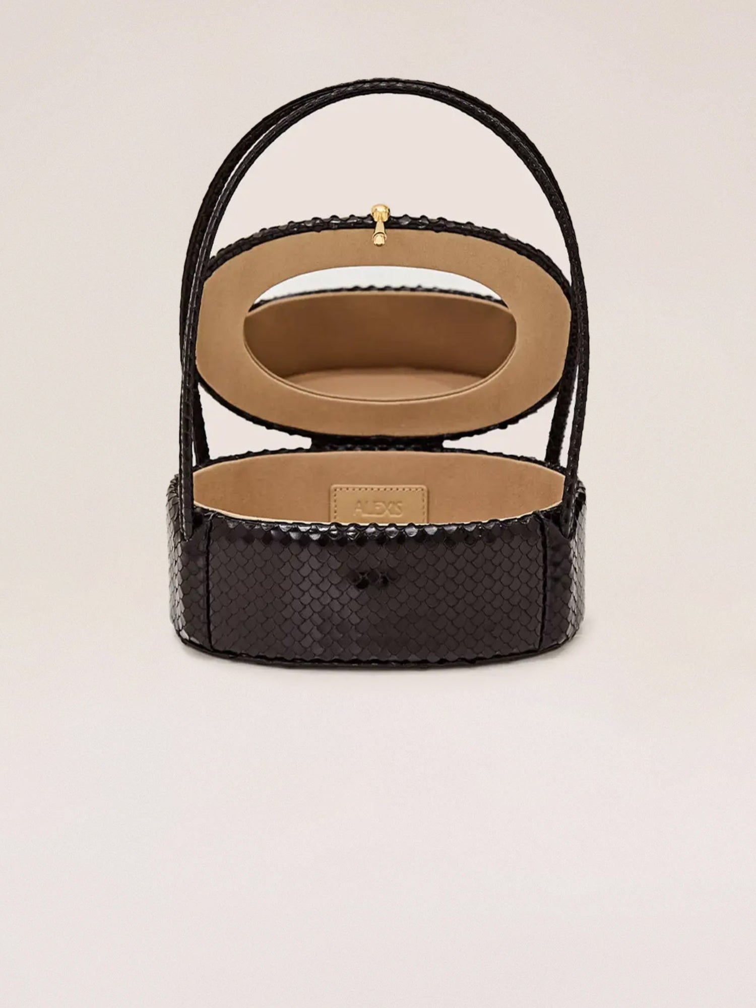 The Constance is a petite oval, top-handle handbag crafted featuring a lock closure. Designed with both style and functionality in mind, it also includes a built-in mirror inside for effortless touch-ups on the go.