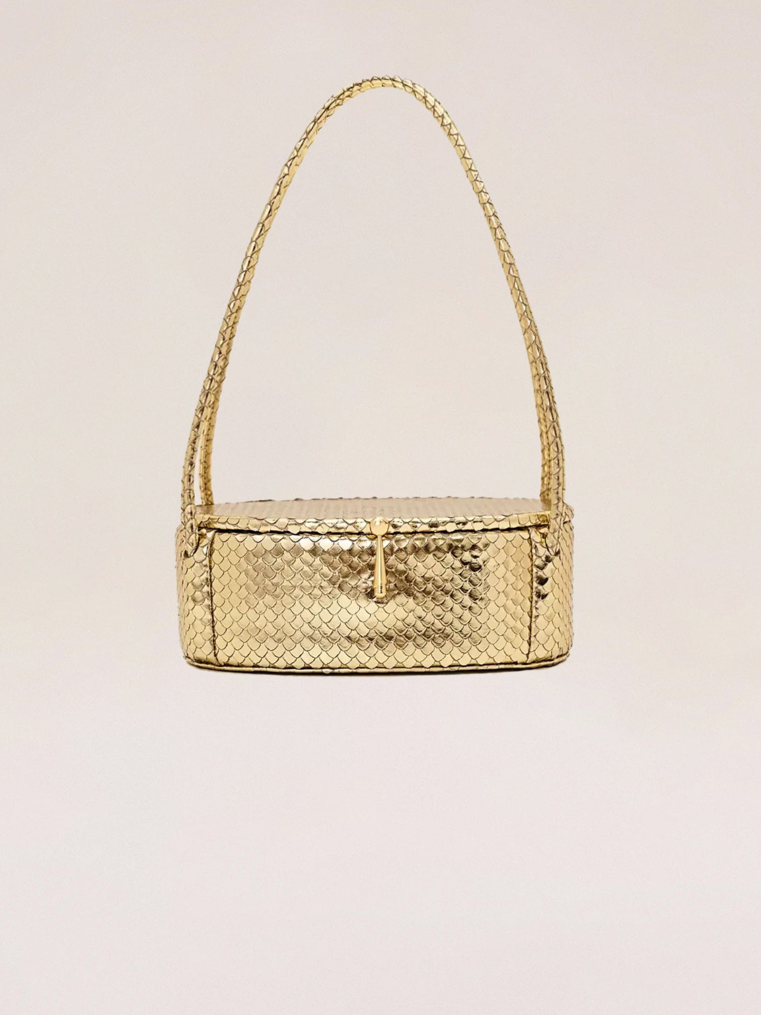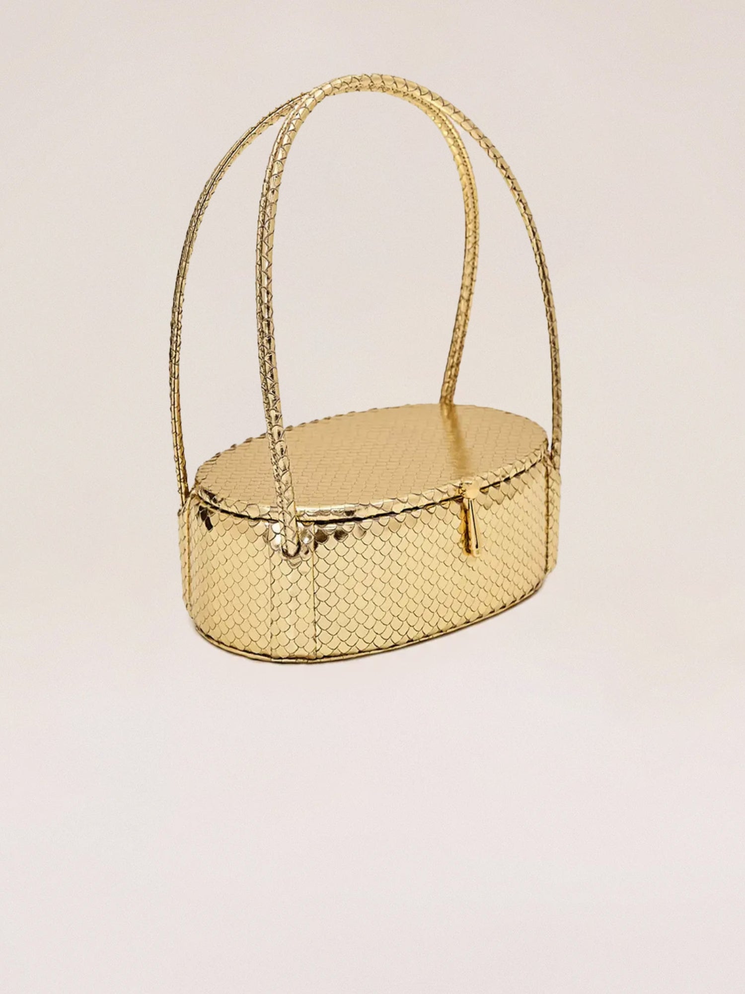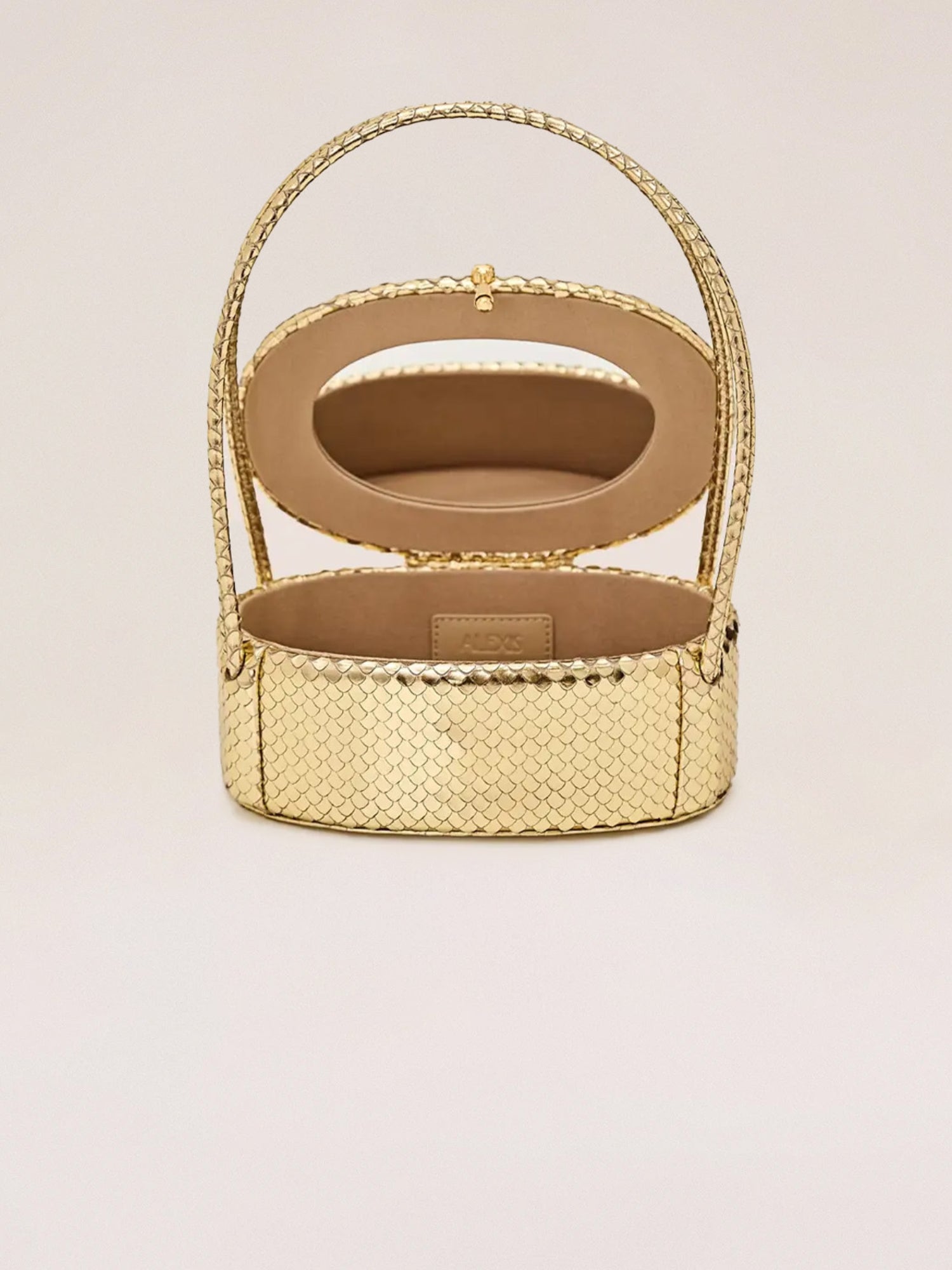 The Constance is a petite oval, top-handle handbag crafted featuring a lock closure. Designed with both style and functionality in mind, it also includes a built-in mirror inside for effortless touch-ups on the go.