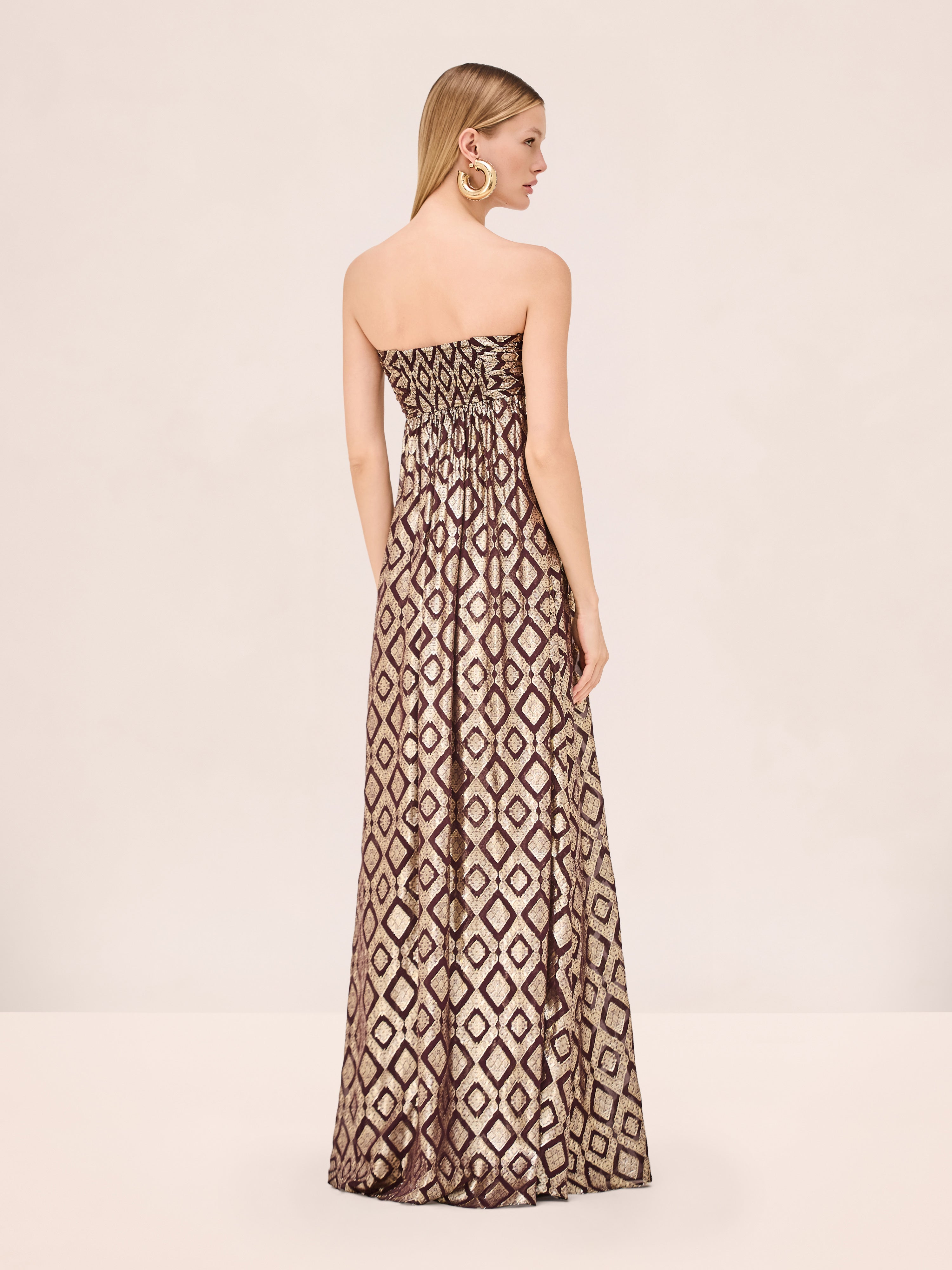 The Maxine Pant is a wide leg silhouette featuring a metallic diamond jacquard pattern, paired with the Izza Top.