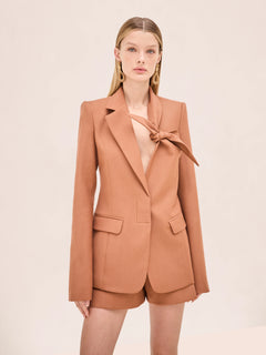The Xander Short is a high-waisted tailored short featuring a button front with sculptural gold hardware and a scalloped hem.