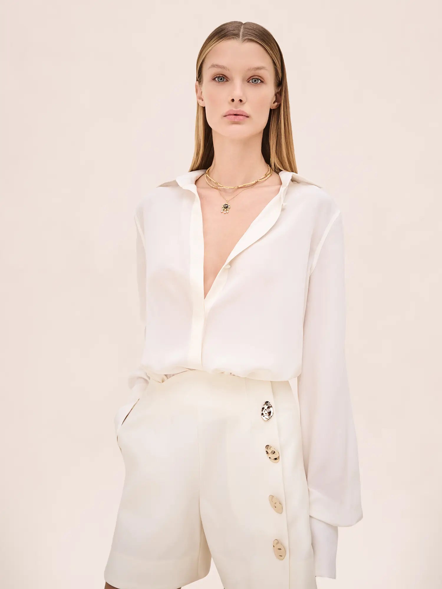 The Xander Short is a high-waisted tailored short featuring a button front with sculptural gold hardware and a scalloped hem.