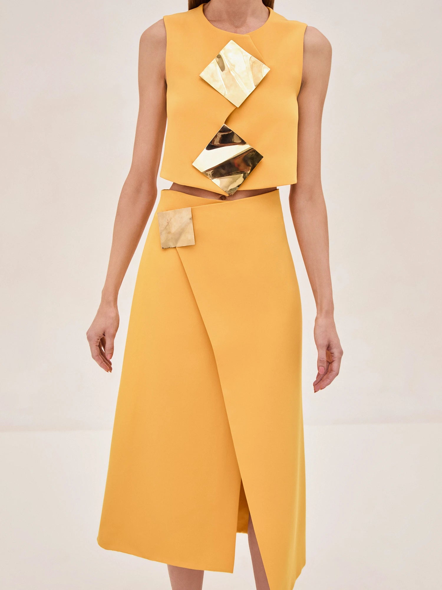 The Zilai Skirt boasts a sharp, tailored design with a high waist, lending a classic yet modern aesthetic. Adorned with a striking metallic geometric embellishment, the Zilai Skirt exudes a contemporary edge that perfectly complements its minimalist style. Coordinate it with the Athens Top for a cohesive look.