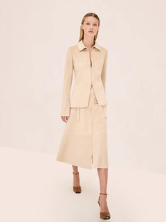 The Jenny Skirt is an A-line skirt midi skirt, featuring front flap pocket detailing and a center seam.