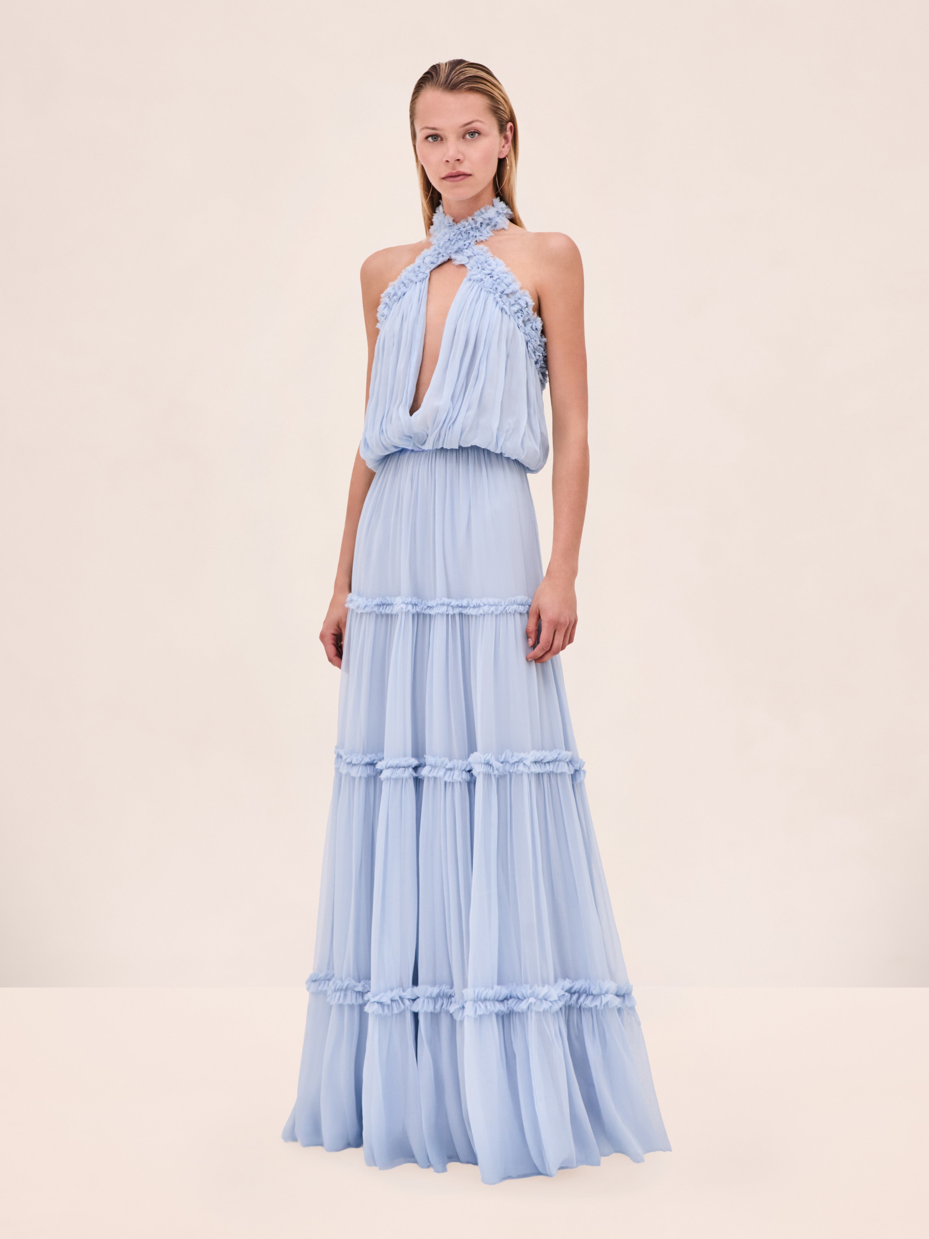 The Izbelle Dress is a crinkled chiffon gown featuring tiered, ruffled accents and a floral halter detail at the neckline.