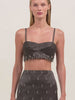The Mili Top is a cropped bustier silhouette with beaded embellishments along the hem, paired with the Luisa Skirt.