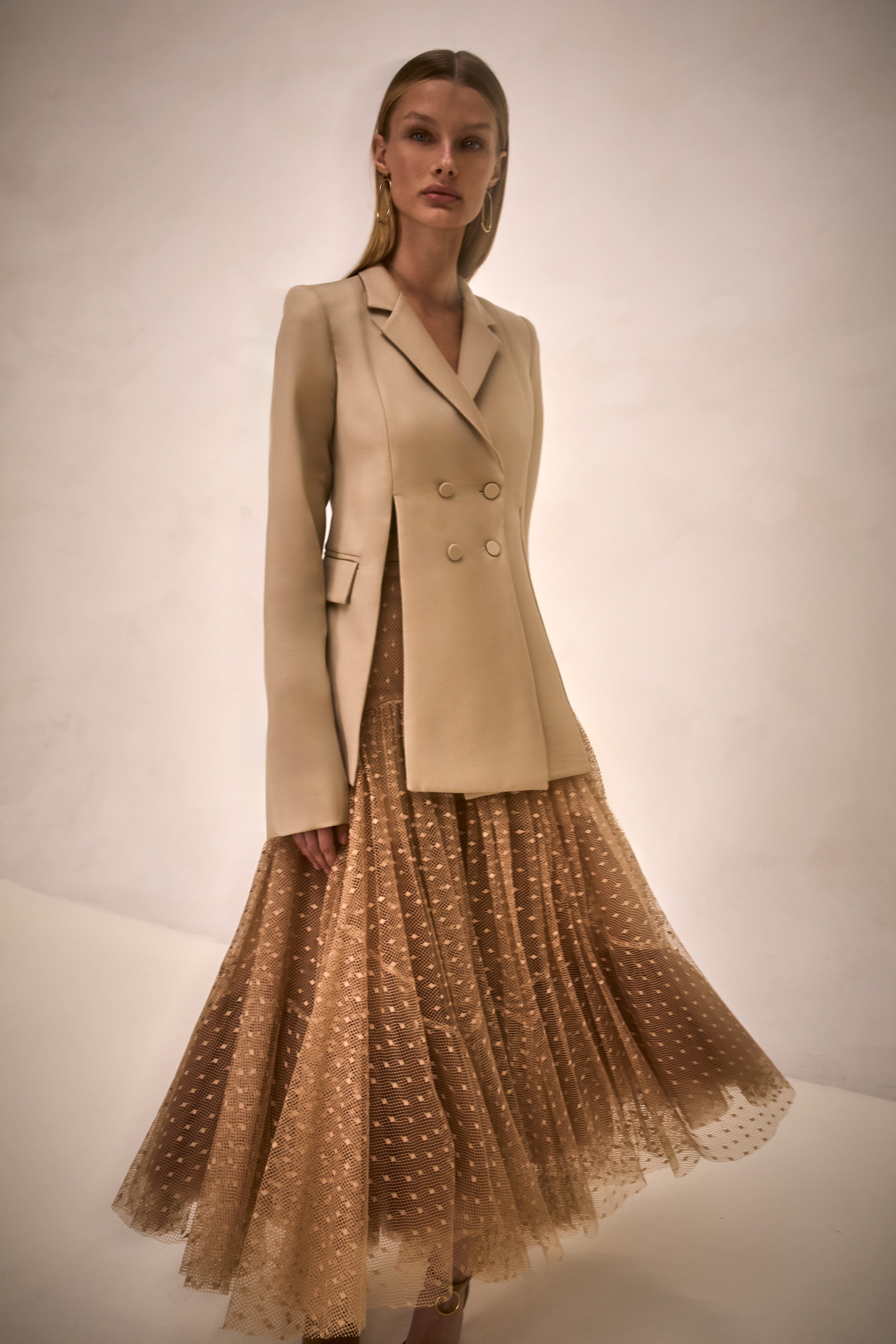 The Naomi Skirt is an A-line midi skirt crafted in sheer polka-dot lace with a voluminous, layered silhouette.