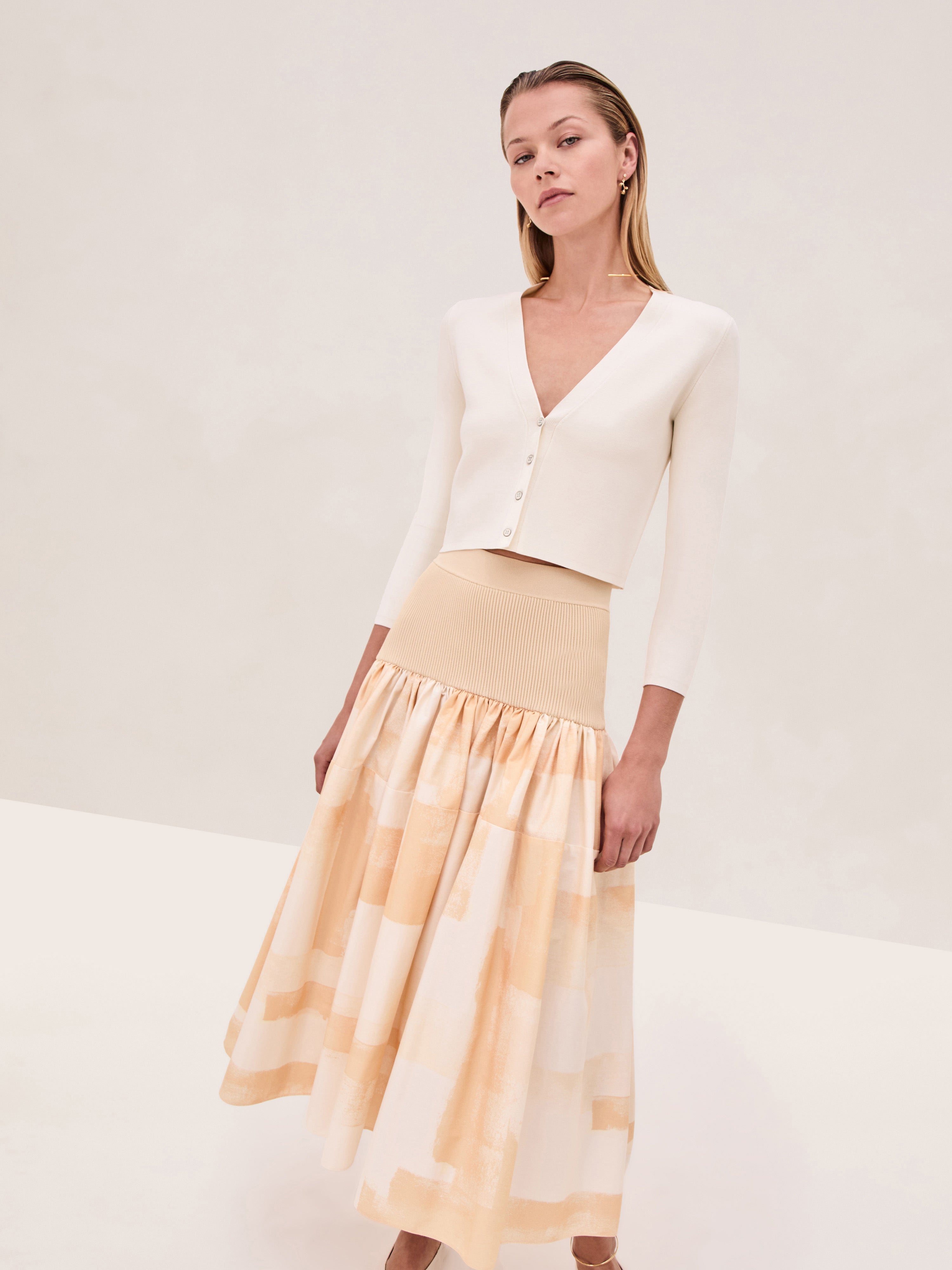 The Aldeo Cardigan is a cropped cardigan featuring a V-neckline and a button-down front.