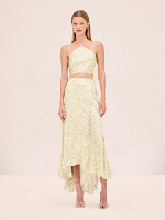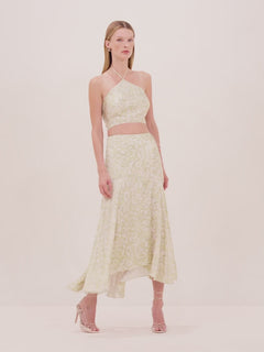 The Nali Top is a halter-style crop top featuring an abstract printed design, paired with the Alzena Skirt.