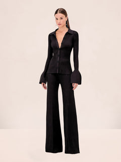 The Olena Top is a ribbed knit button-down with a collared neckline and flared cuffs, paired with the Boda Pant.