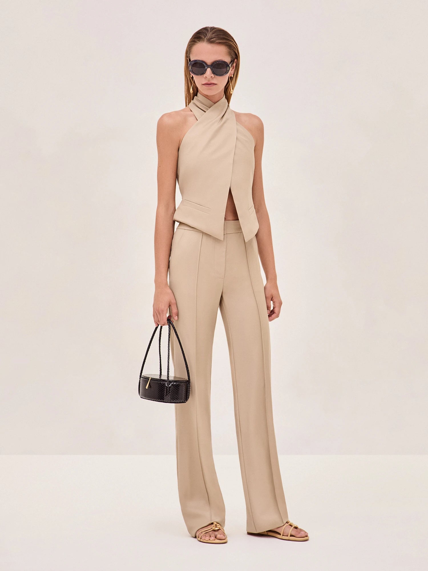 The Olfi Vest features a chic halter neckline and wrap-front design. Pair it with the Duke Pant for a sleek, head-to-toe look.