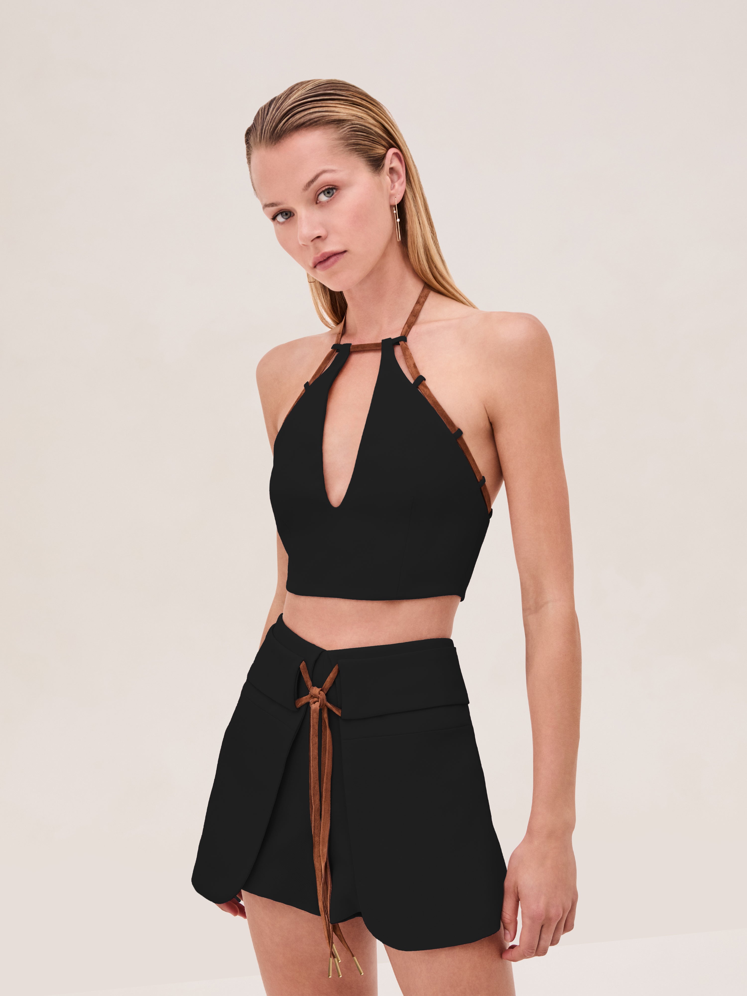 The Saya Top is a twill halter crop top featuring a keyhole neckline and accentuated with a suede frame loop detailing, paired with the Prato Skort.