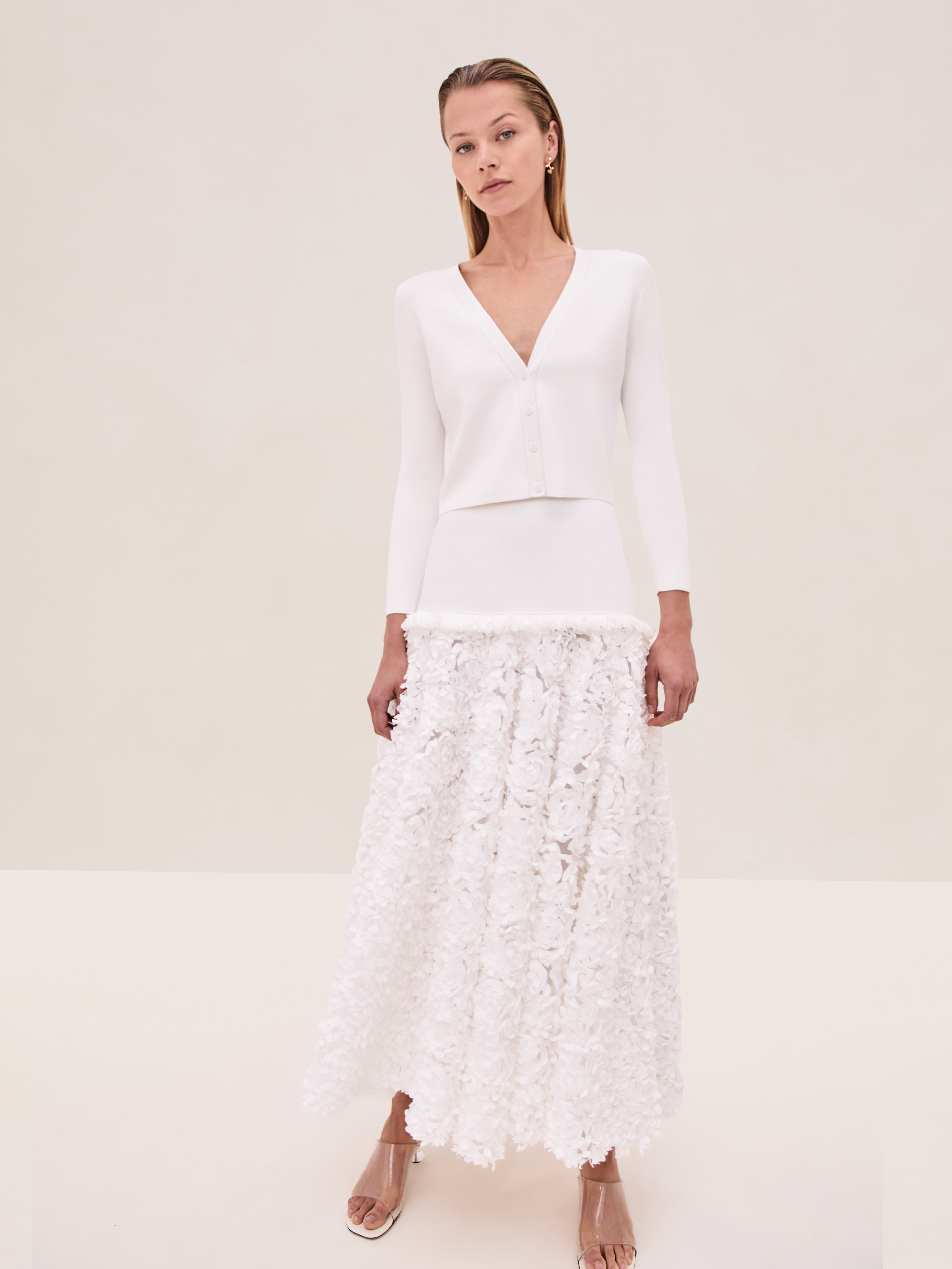 The Aldeo Cardigan is a cropped cardigan featuring a V-neckline and a button-down front.