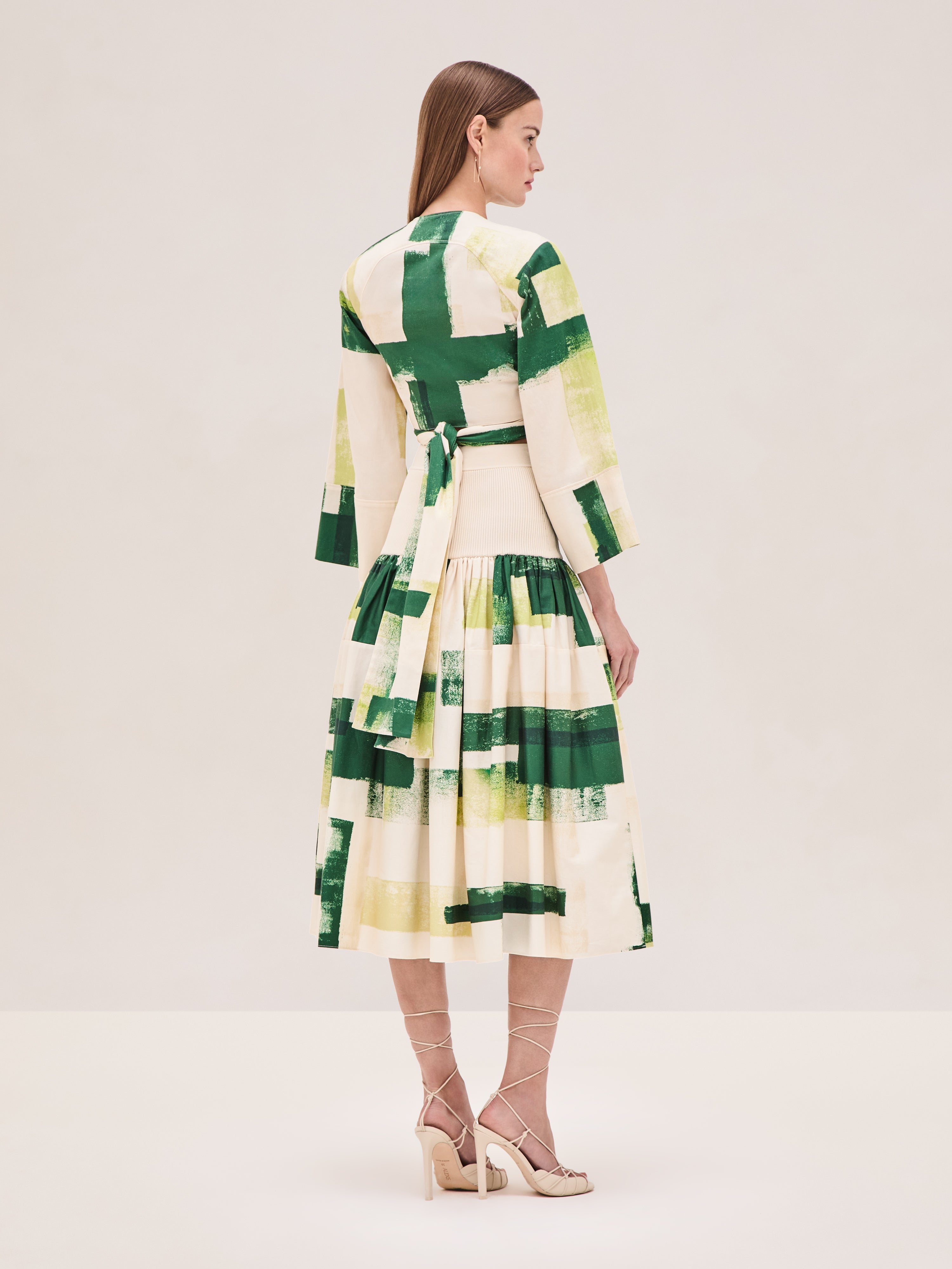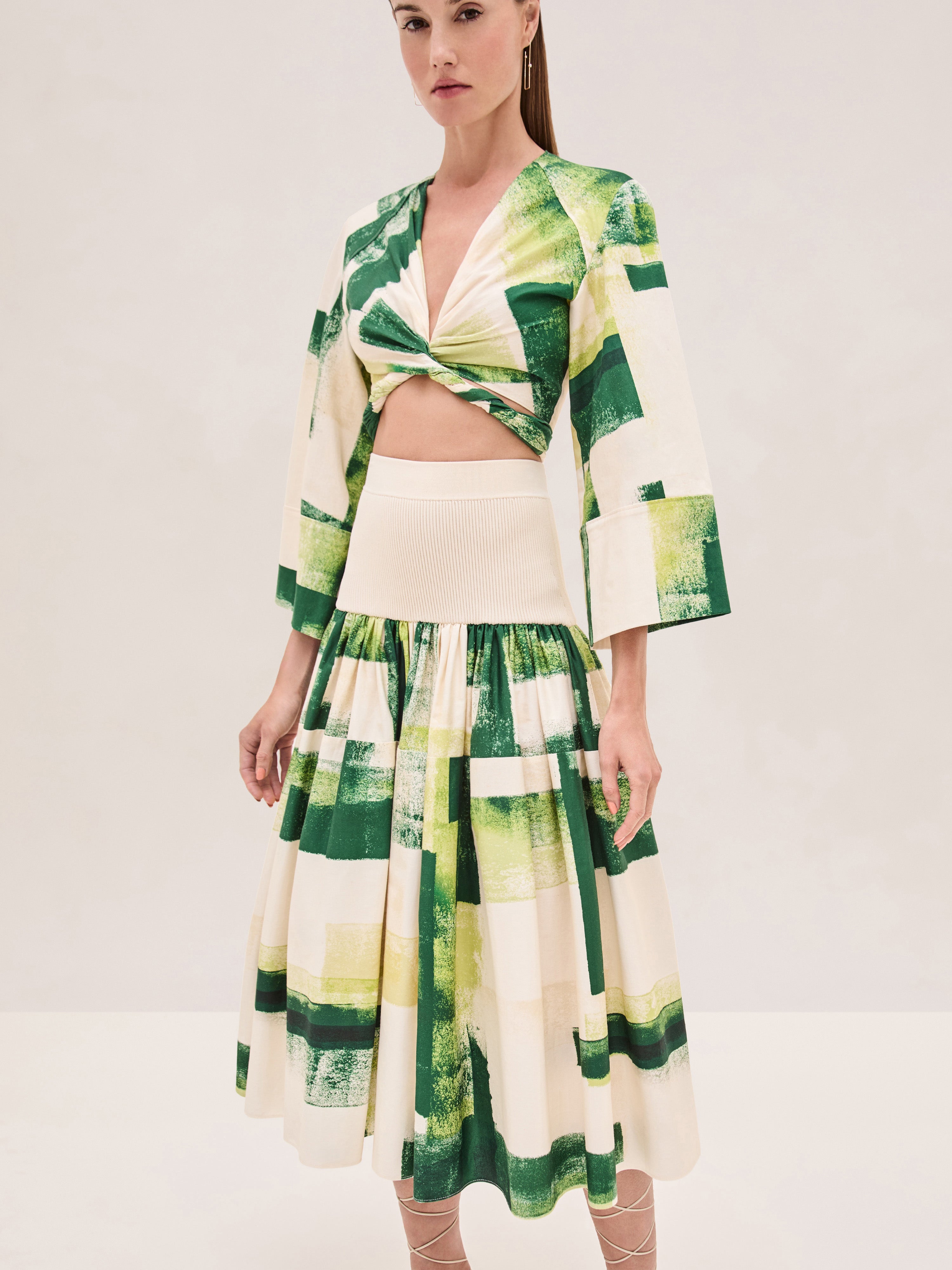 The Ansalm Top is a printed wrap top with voluminous cuffed sleeves, paired with the Arnette Skirt.