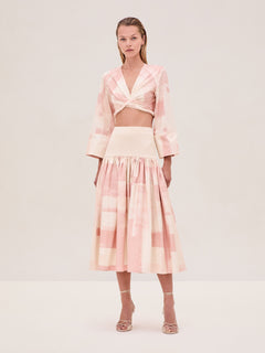 The Ansalm Top is a printed wrap top with voluminous cuffed sleeves, paired with the Arnette Skirt.
