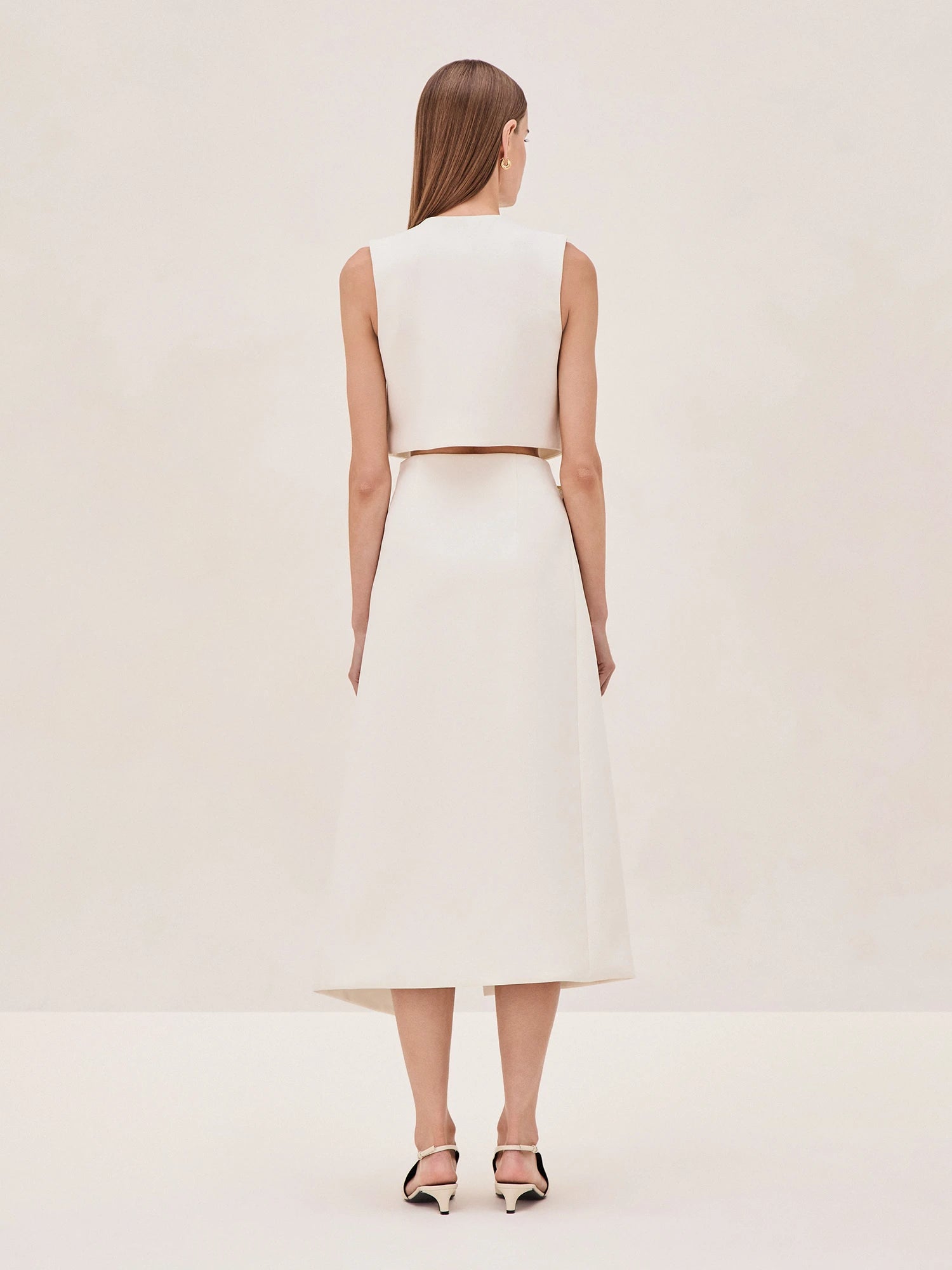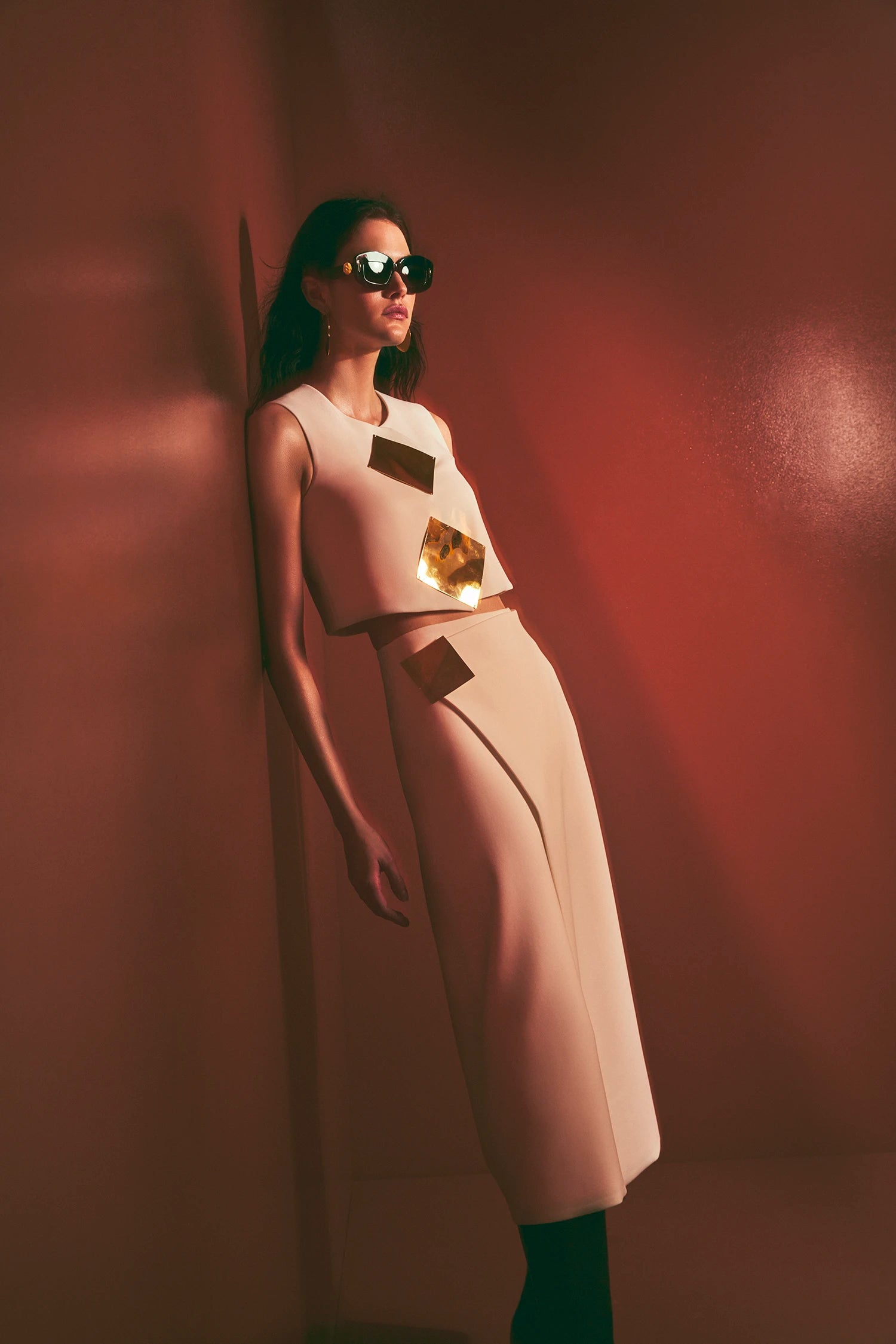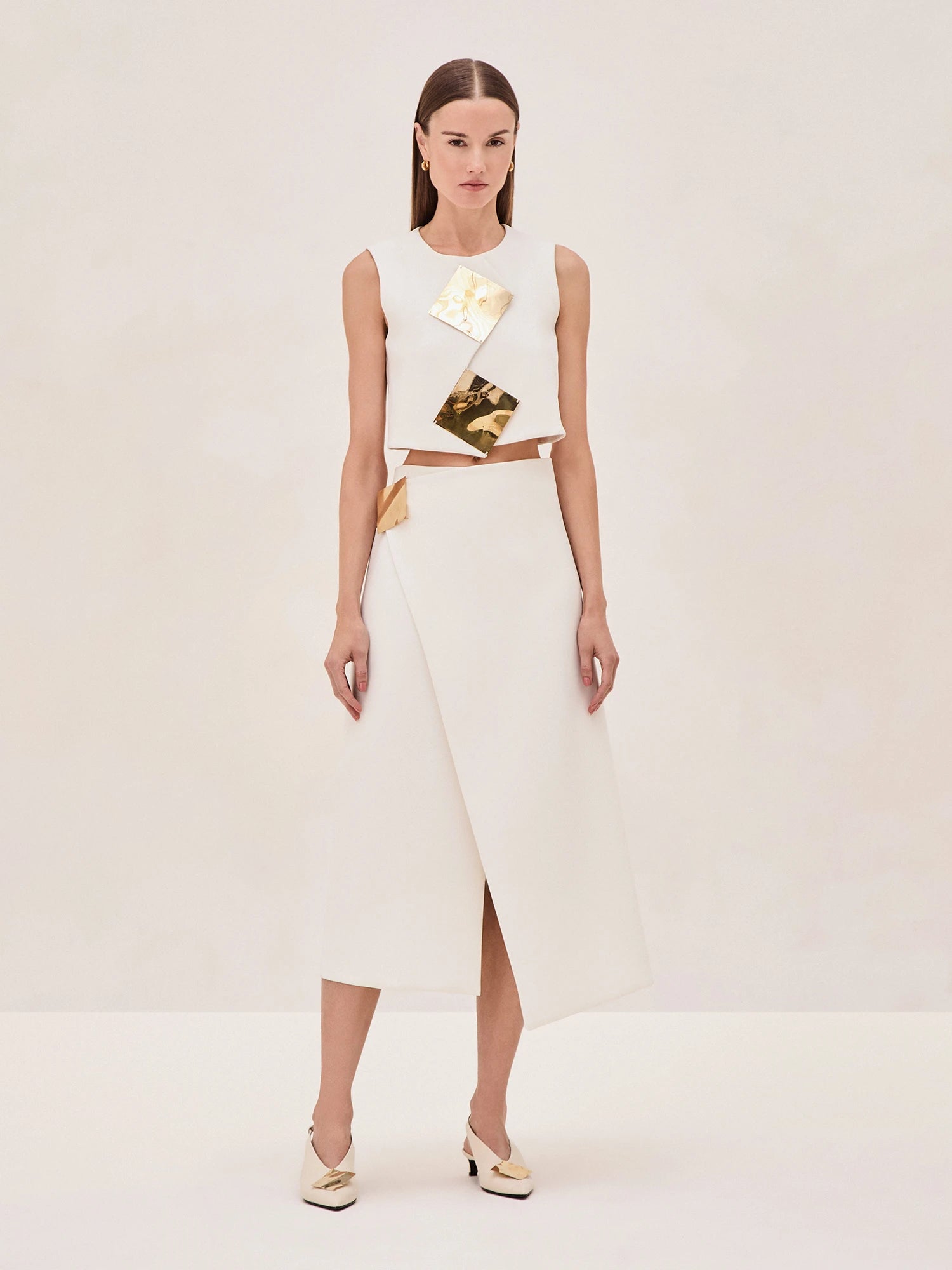 The Athens Top features a clean, structured silhouette, elevated by striking metallic geometric embellishments that add a contemporary flair. Designed to pair effortlessly with the Zilai Skirt, the Athens Top creates a cohesive and chic ensemble. The cropped length offers a flattering balance when styled with high-waisted pieces, making it versatile for various looks.