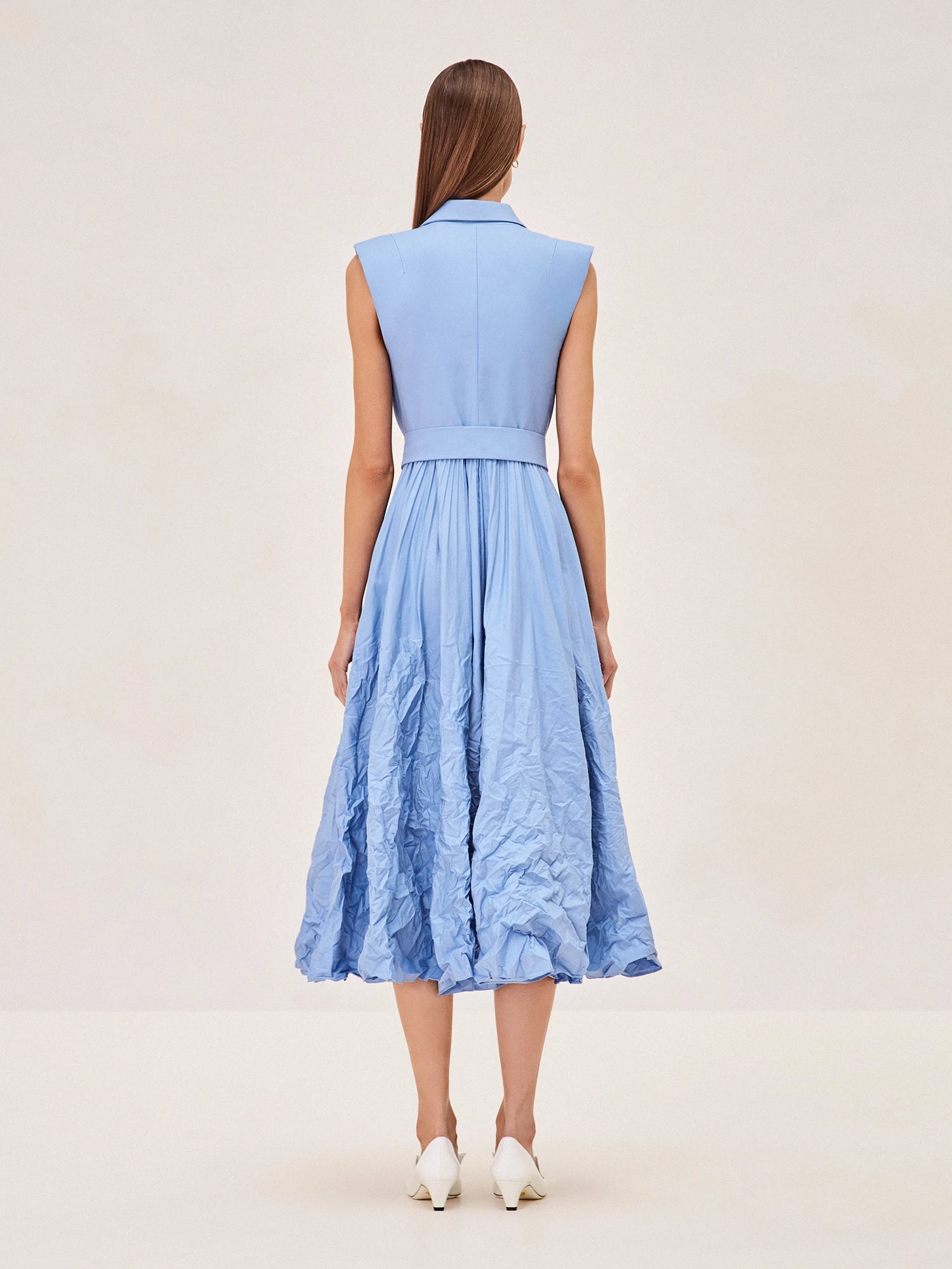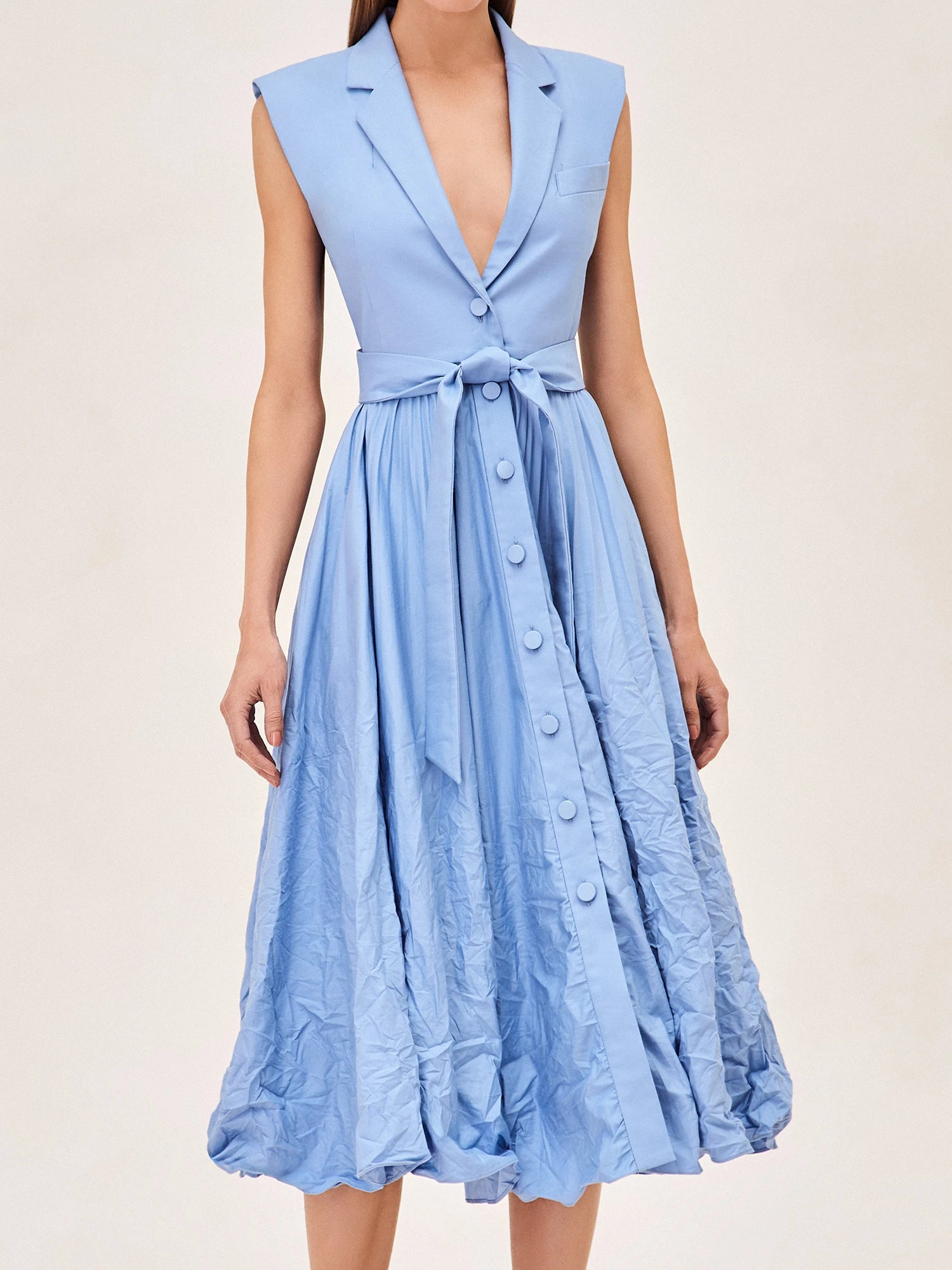 Embrace sophistication and style in the Beau Dress - a perfect fusion of sharp lapels and a fluid, plunging V-neckline. The crisp top harmonizes with the delicate crinkles of the skirt, creating a dynamic texture that moves effortlessly with you. A cinched waist, accented by a matching fabric belt, flatters your figure for a truly stunning silhouette.