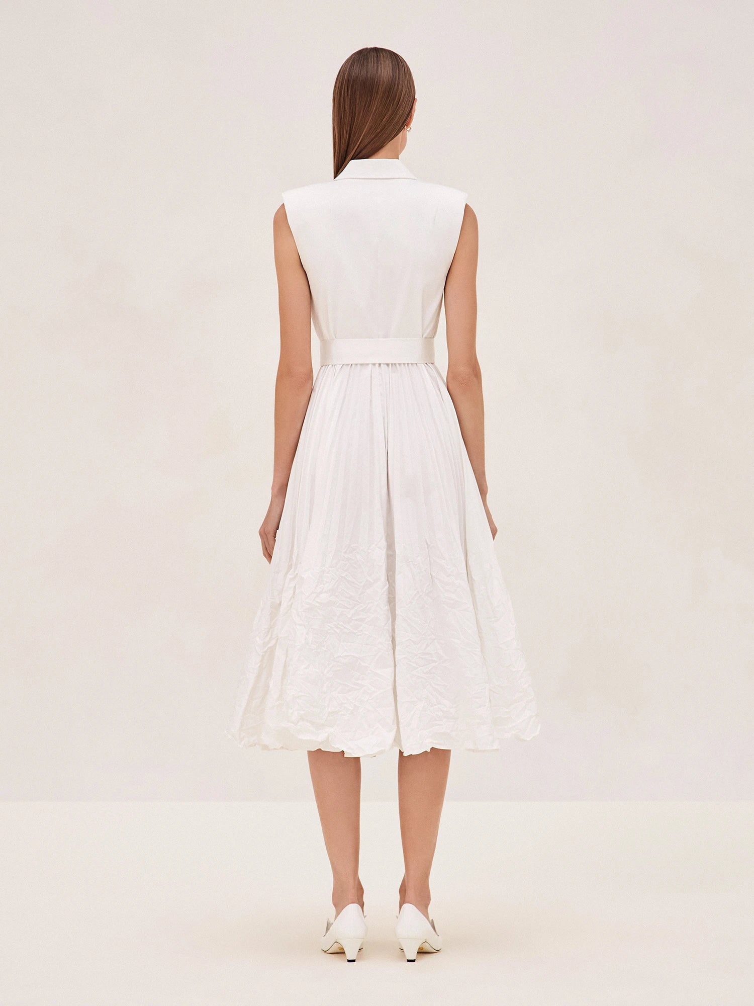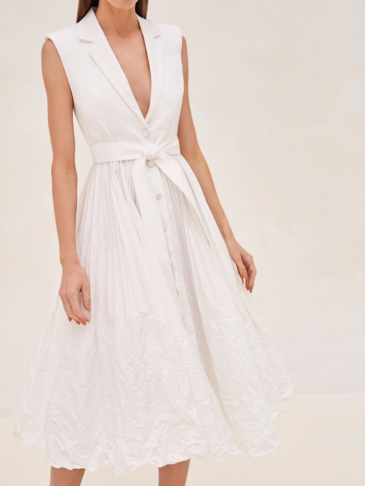 Embrace sophistication and style in the Beau Dress - a perfect fusion of sharp lapels and a fluid, plunging V-neckline. The crisp top harmonizes with the delicate crinkles of the skirt, creating a dynamic texture that moves effortlessly with you. A cinched waist, accented by a matching fabric belt, flatters your figure for a truly stunning silhouette.