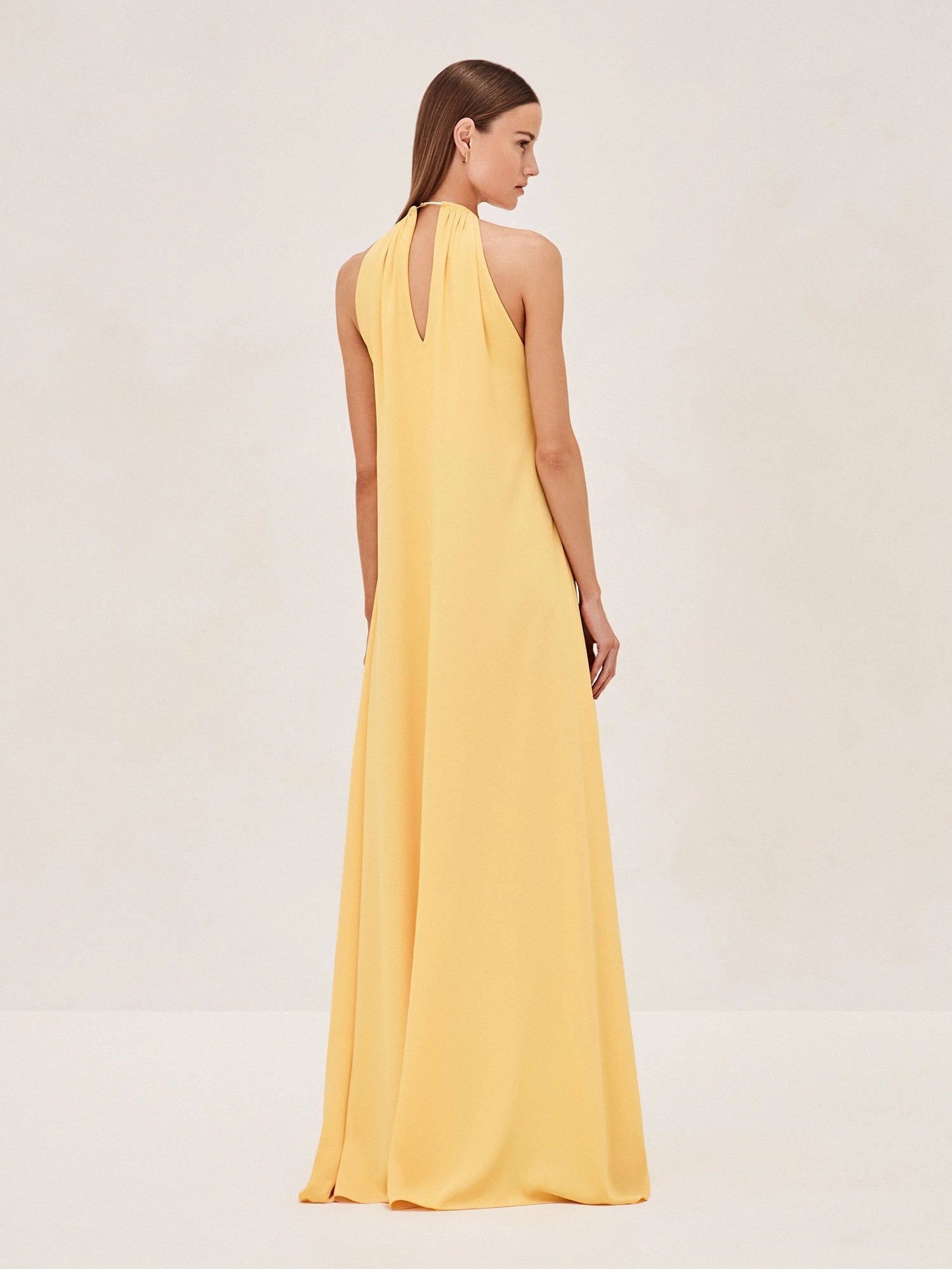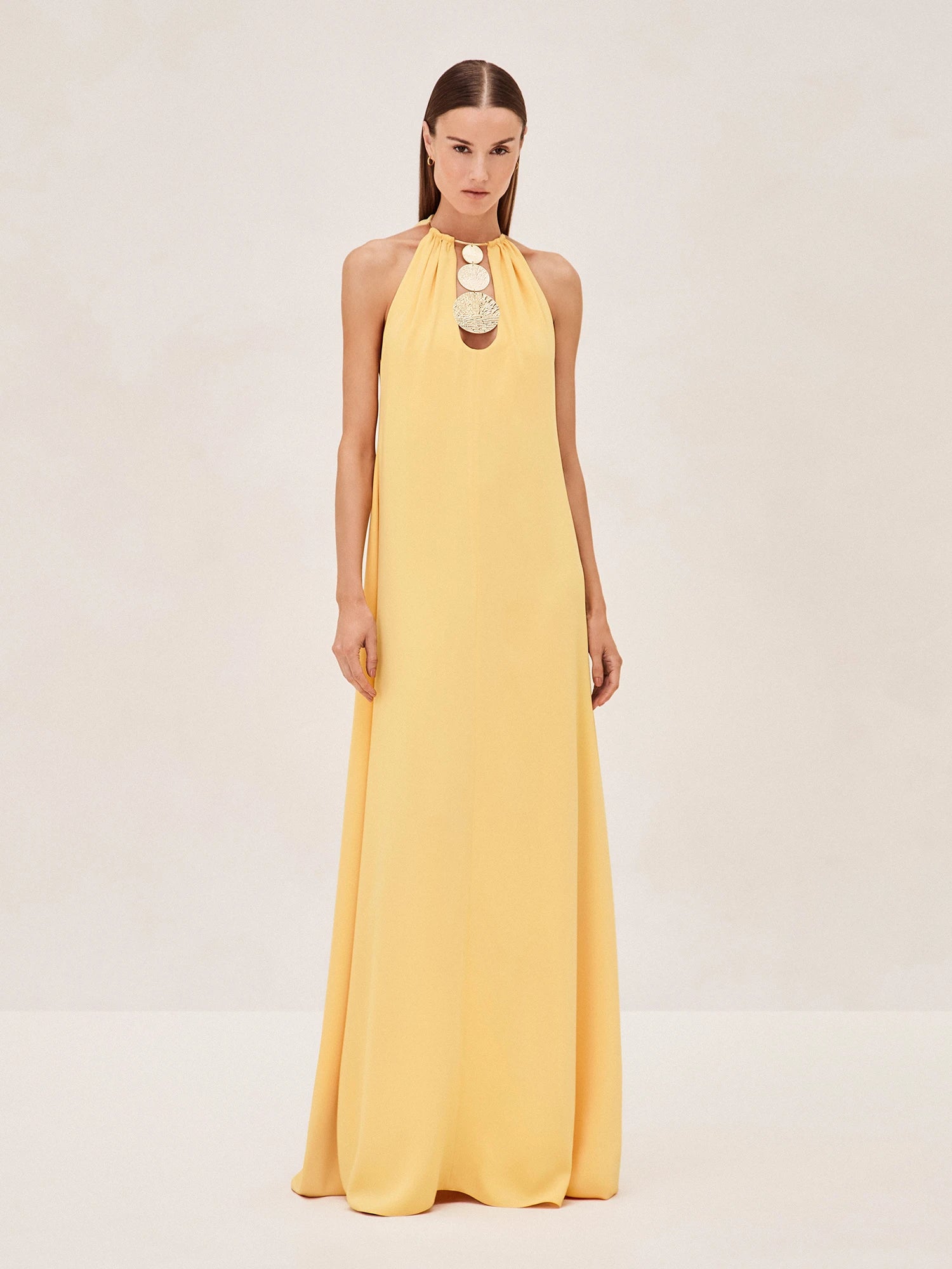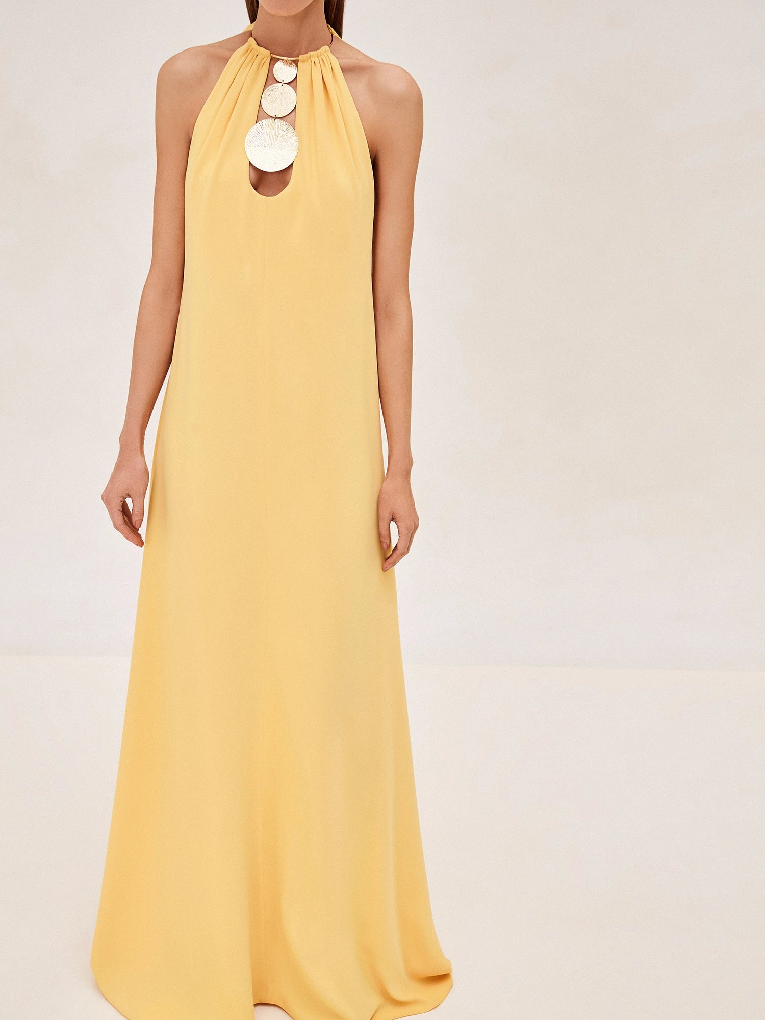 Introducing the Celestino Dress - a stunning display of daring elegance. This floor-length gown embodies the epitome of poise and charm. The elegant high-neck design gracefully meets at the nape, leaving the shoulders bare for a touch of refined allure. Adorned with cascading golden coin embellishments along the neckline, it's a dress that demands to be noticed. Flowing effortlessly, the Celestino Dress will captivate with its regal drapery.