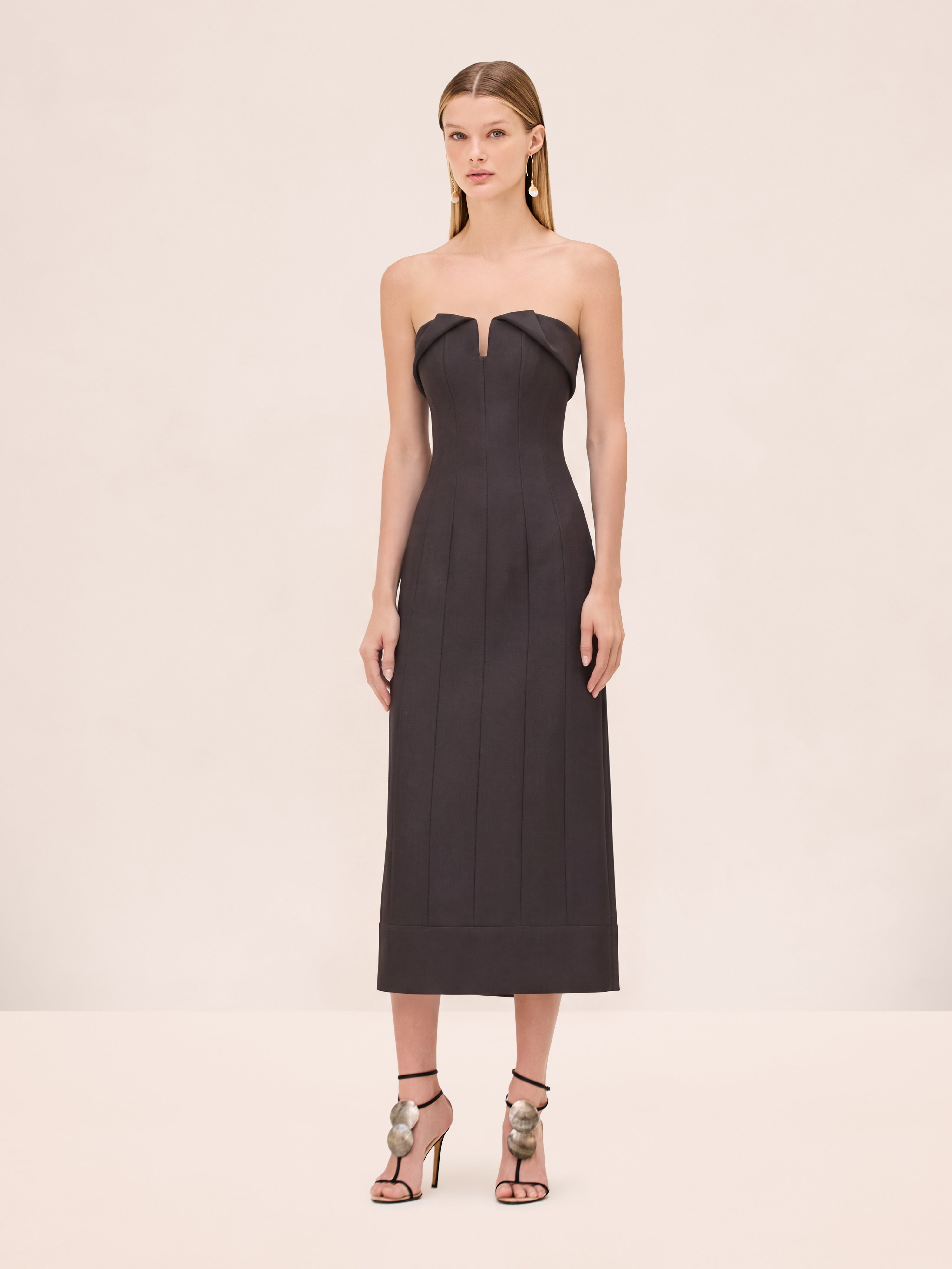 The Donella Dress is a strapless midi silhouette with a sculptural neckline and vertical paneling detail.