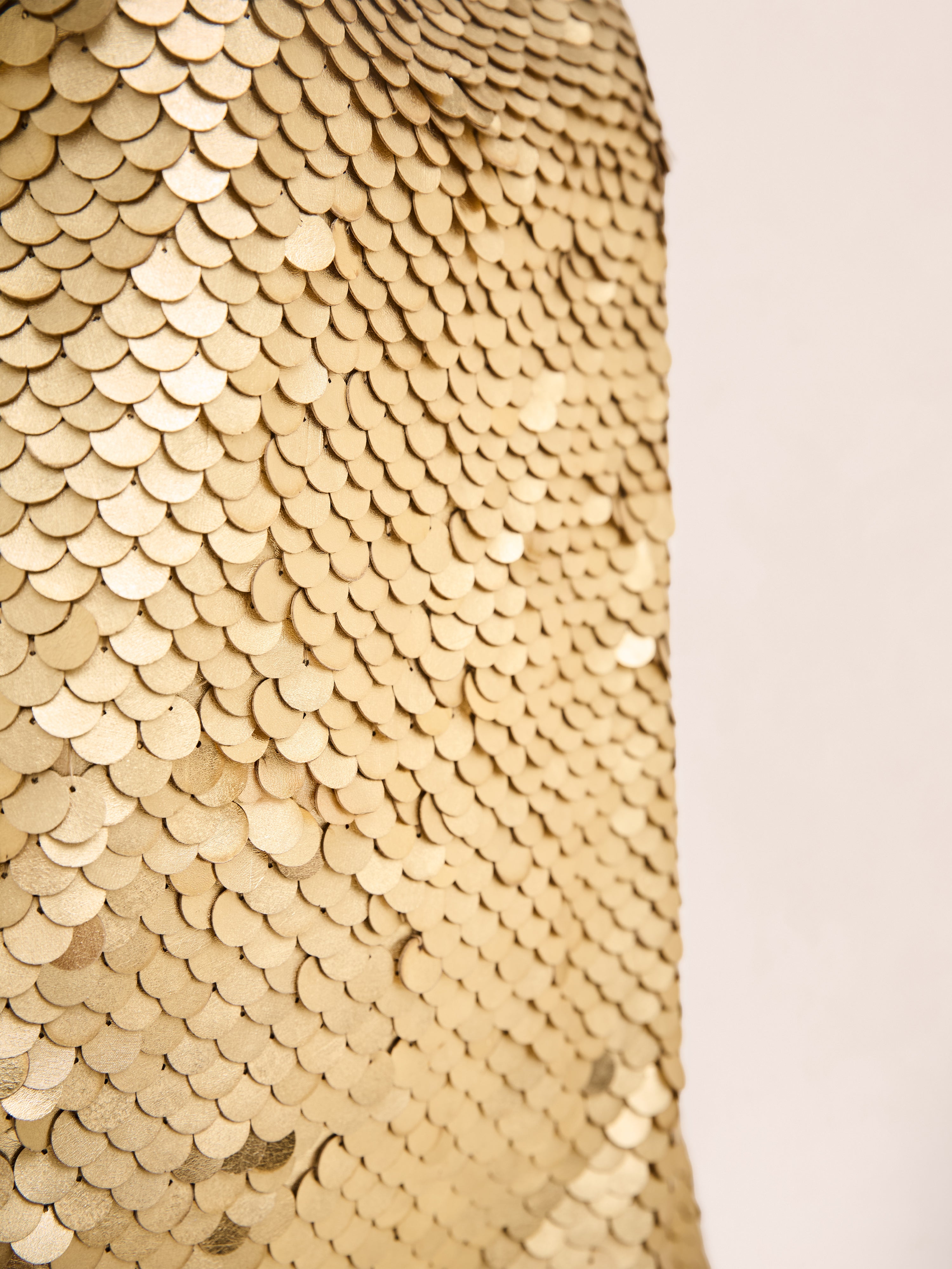 The Eli Dress is a mini dress featuring a scoop neckline, detailed with gold leather paillettes.