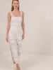 The Evelyn Dress is a midi dress featuring openwork embroidery and a pom-pom trim.