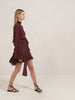 The Giovanna Dress is a long sleeve mini dress featuring ruffled trim, a smocked high neckline, and a cascading tie-front detail.