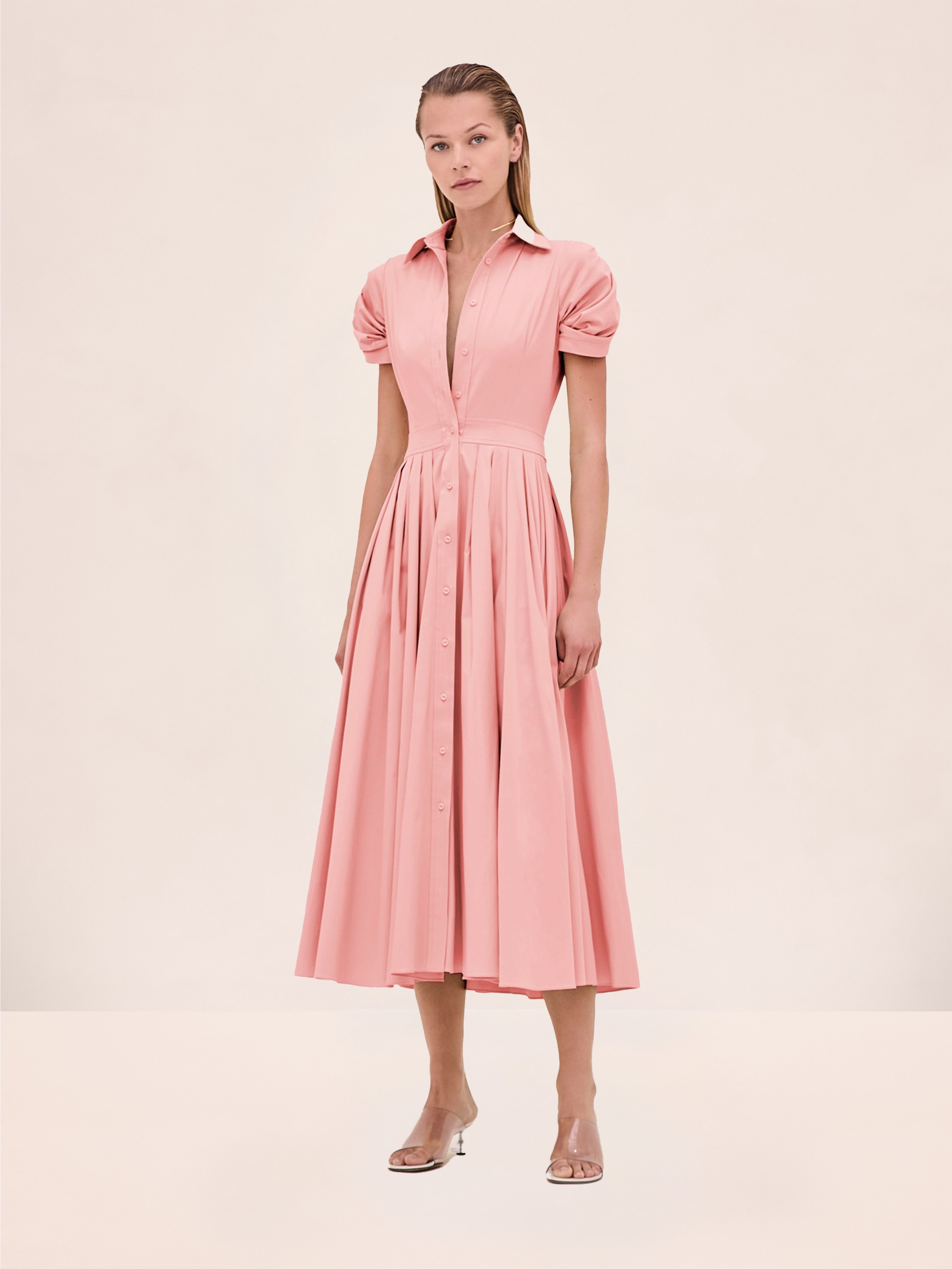 The Gyles Dress is a cotton poplin midi featuring a structured shirt collar, button-down front, and soft pleating.