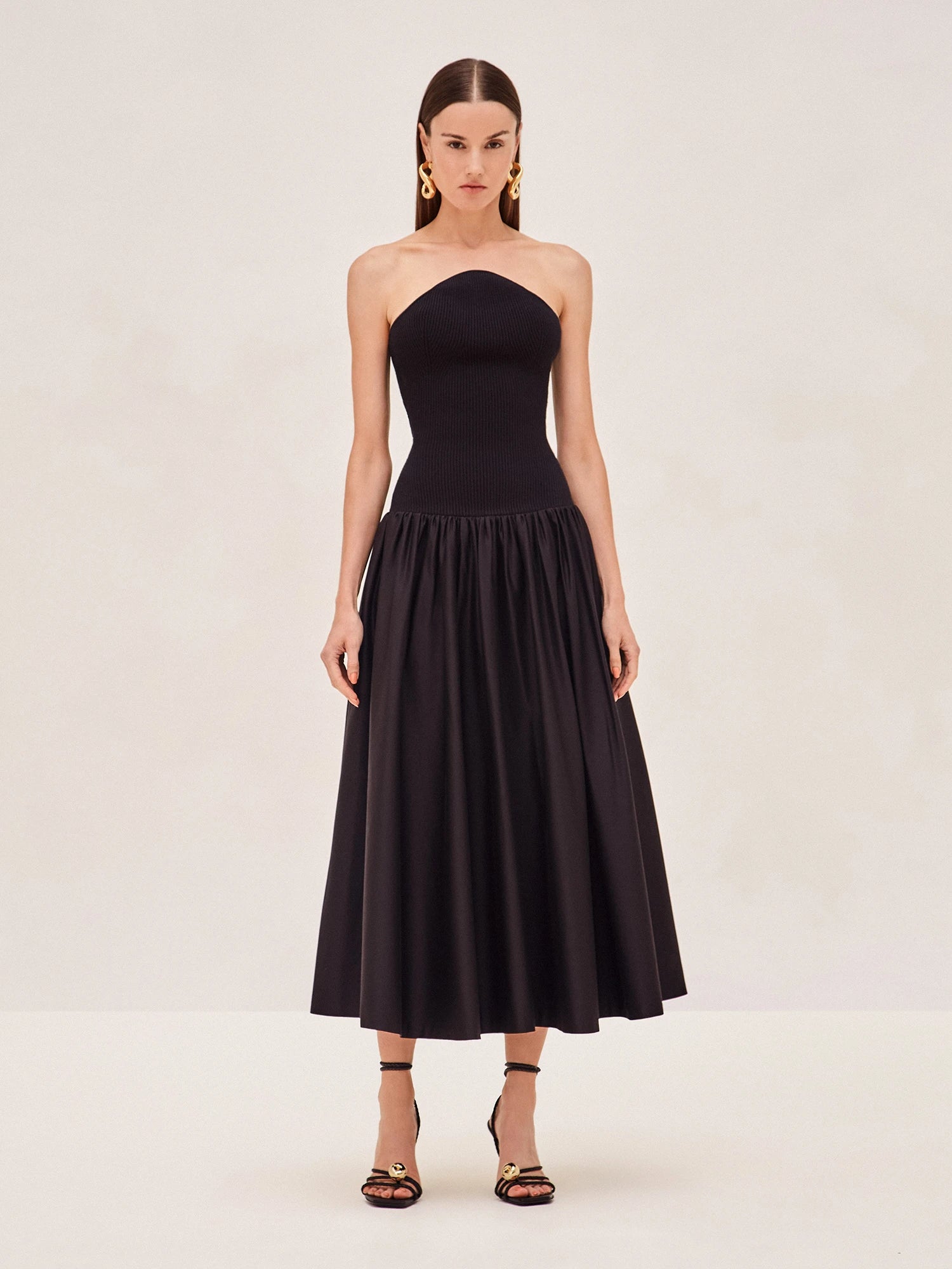 The Kamali Dress showcases a sleek, strapless bodice adorned with a textured ribbed pattern that accentuates the waist and flatters the silhouette. Fusing into a graceful A-line skirt, the dress creates a captivating contrast with its fluid fabric and delicate pleats, exuding effortless elegance. Pair it with the Russie Capelet for a chic ensemble.