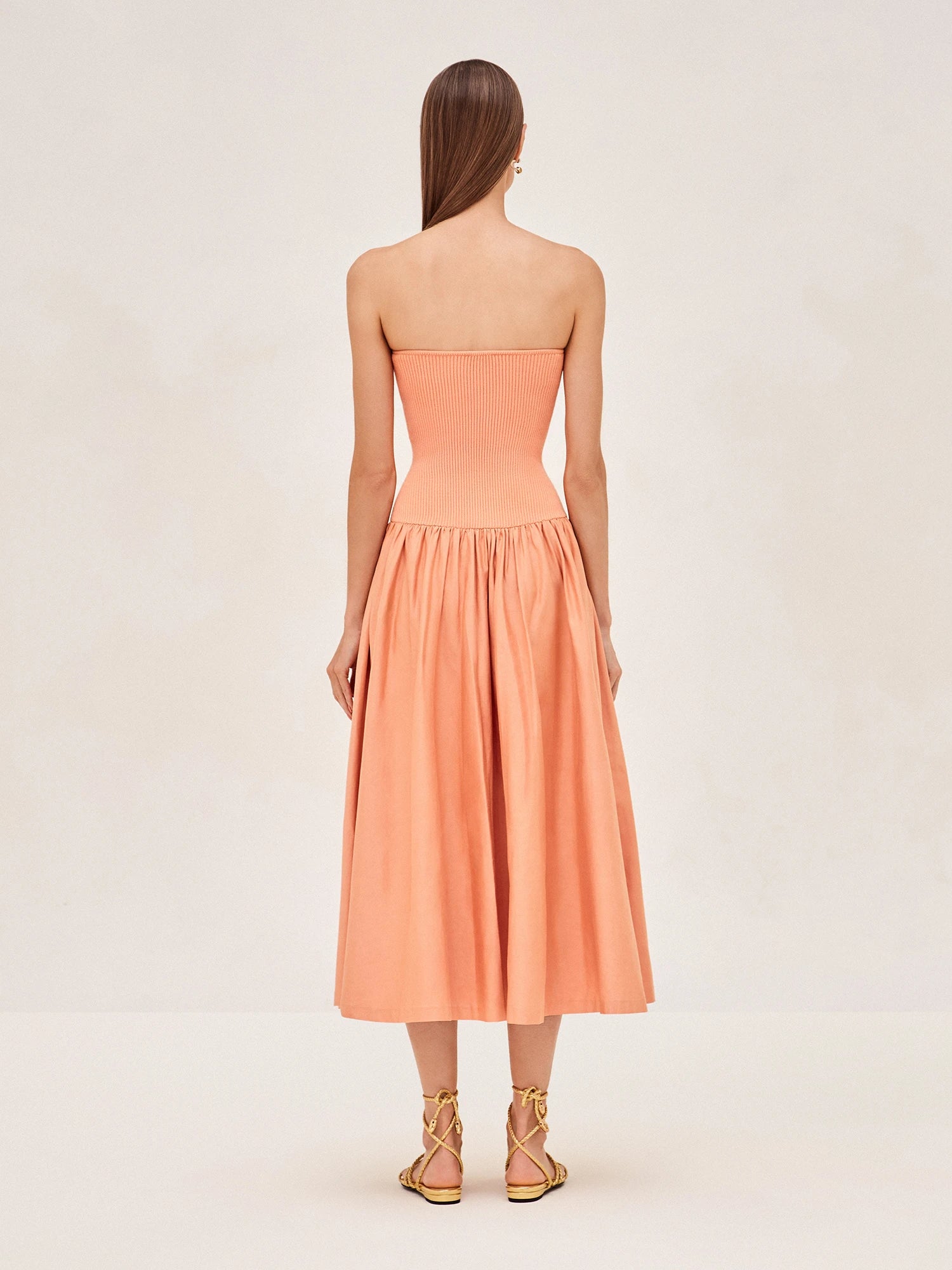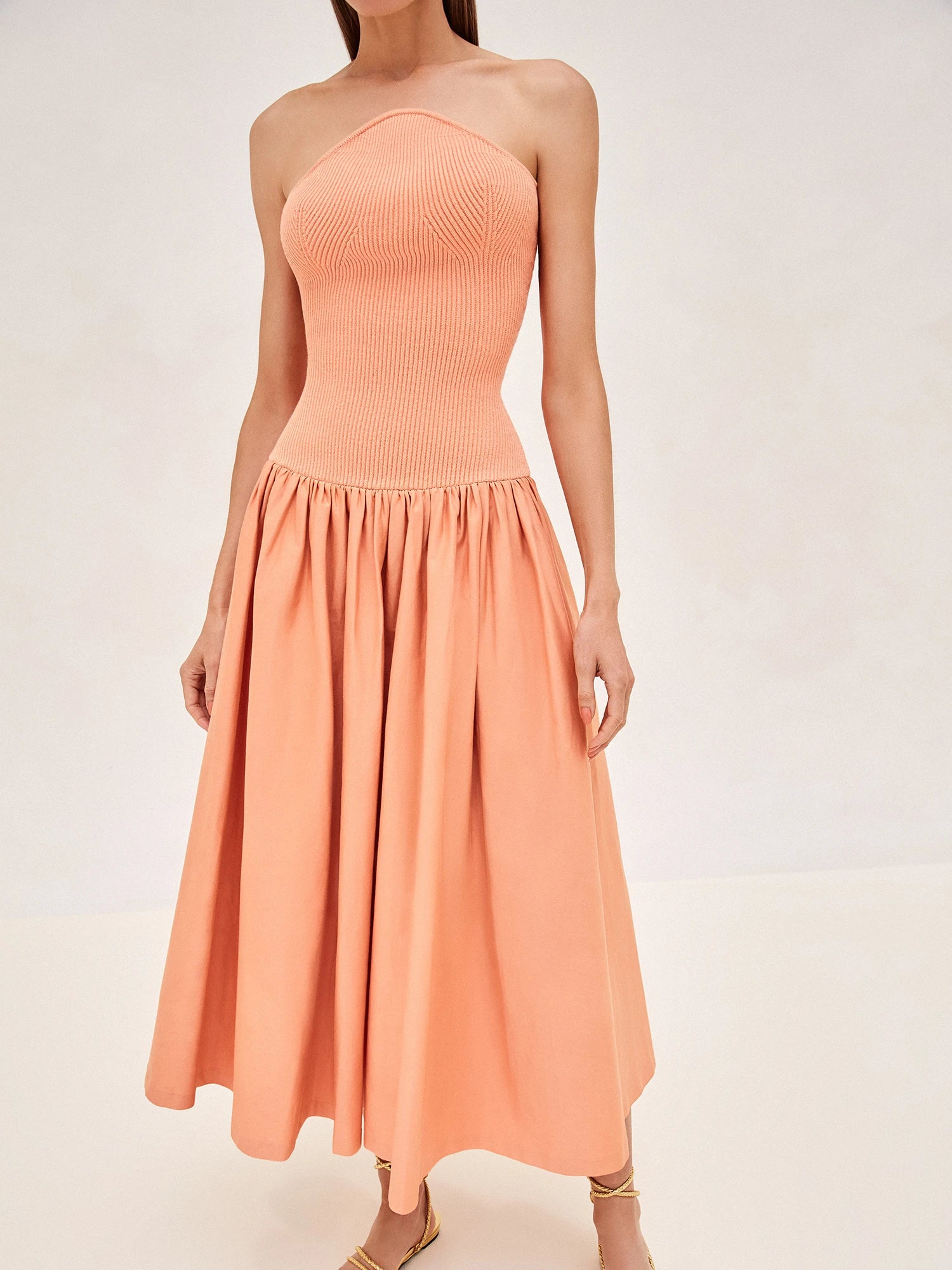 The Kamali Dress showcases a sleek, strapless bodice adorned with a textured ribbed pattern that accentuates the waist and flatters the silhouette. Fusing into a graceful A-line skirt, the dress creates a captivating contrast with its fluid fabric and delicate pleats, exuding effortless elegance. Pair it with the Russie Capelet for a chic ensemble.