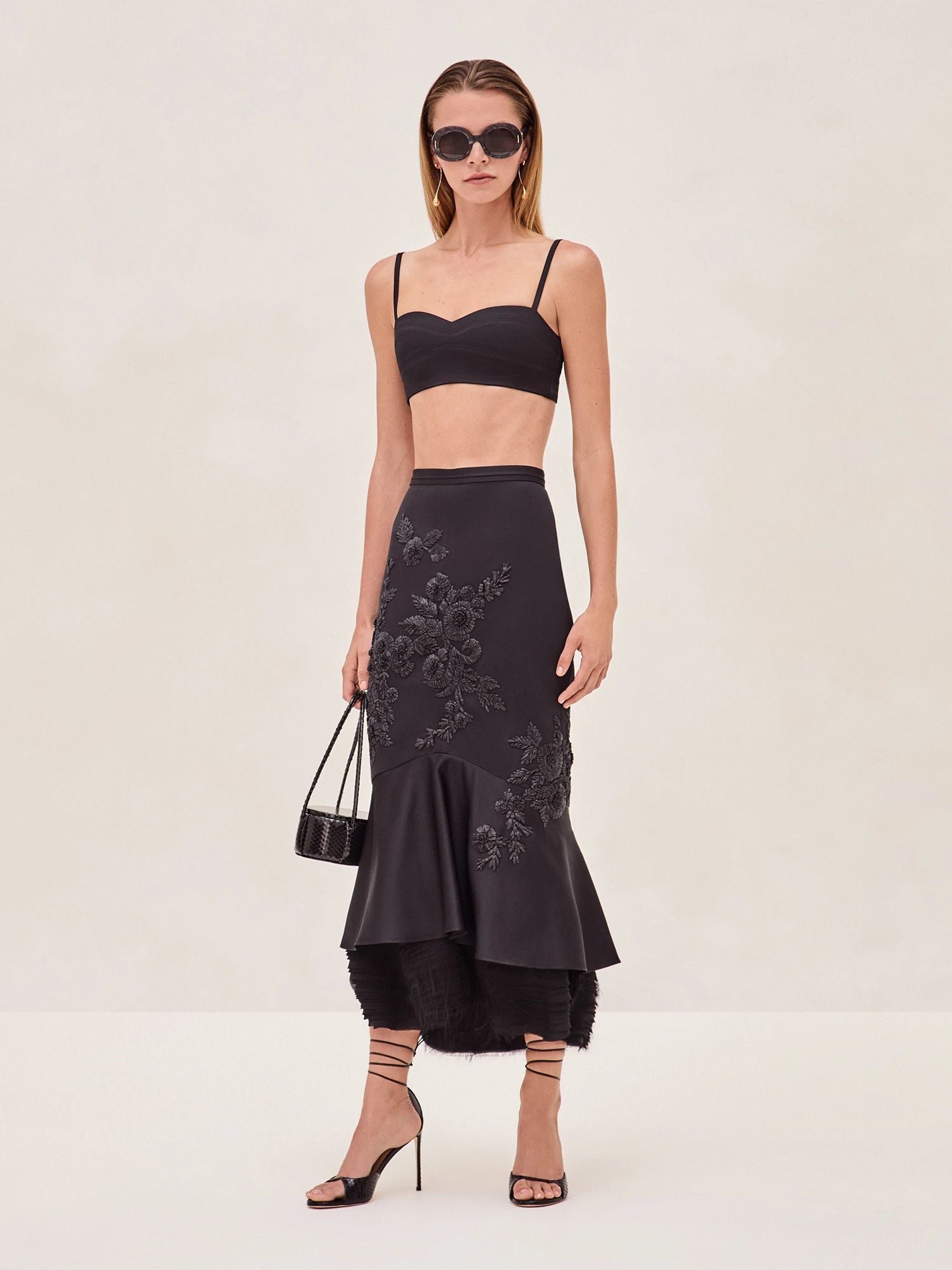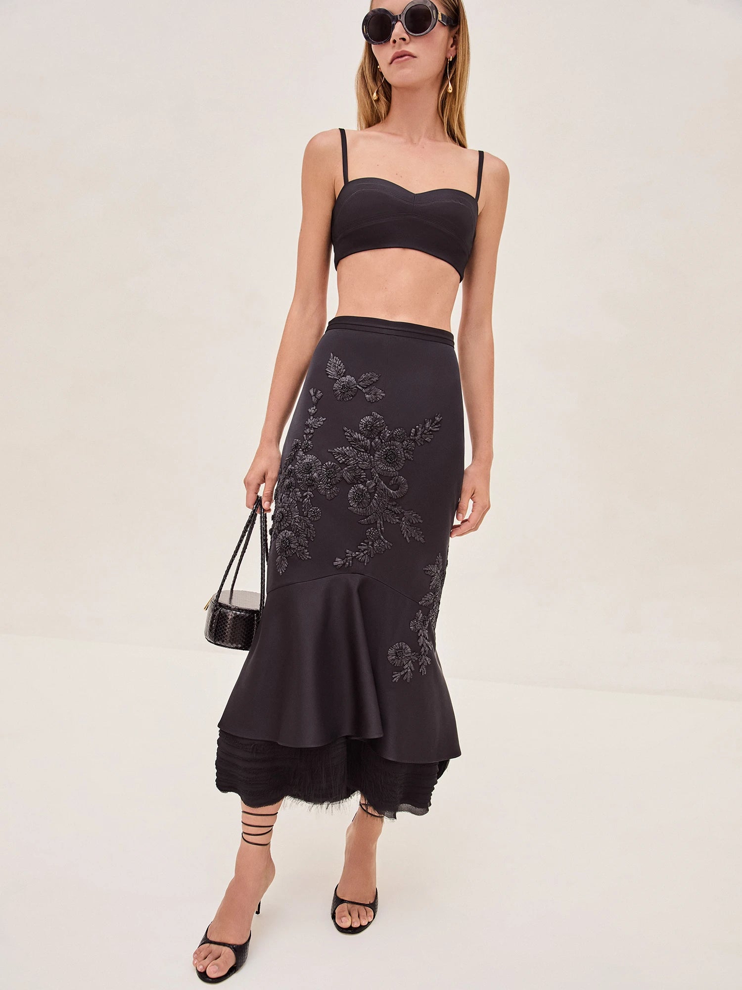 The Kieran Skirt is an exquisite midi style that combines intricate floral embroidery with a flared hemline. Designed with a layered underlay, it adds soft volume and graceful movement. Pair it with the Mili Top for a refined ensemble.