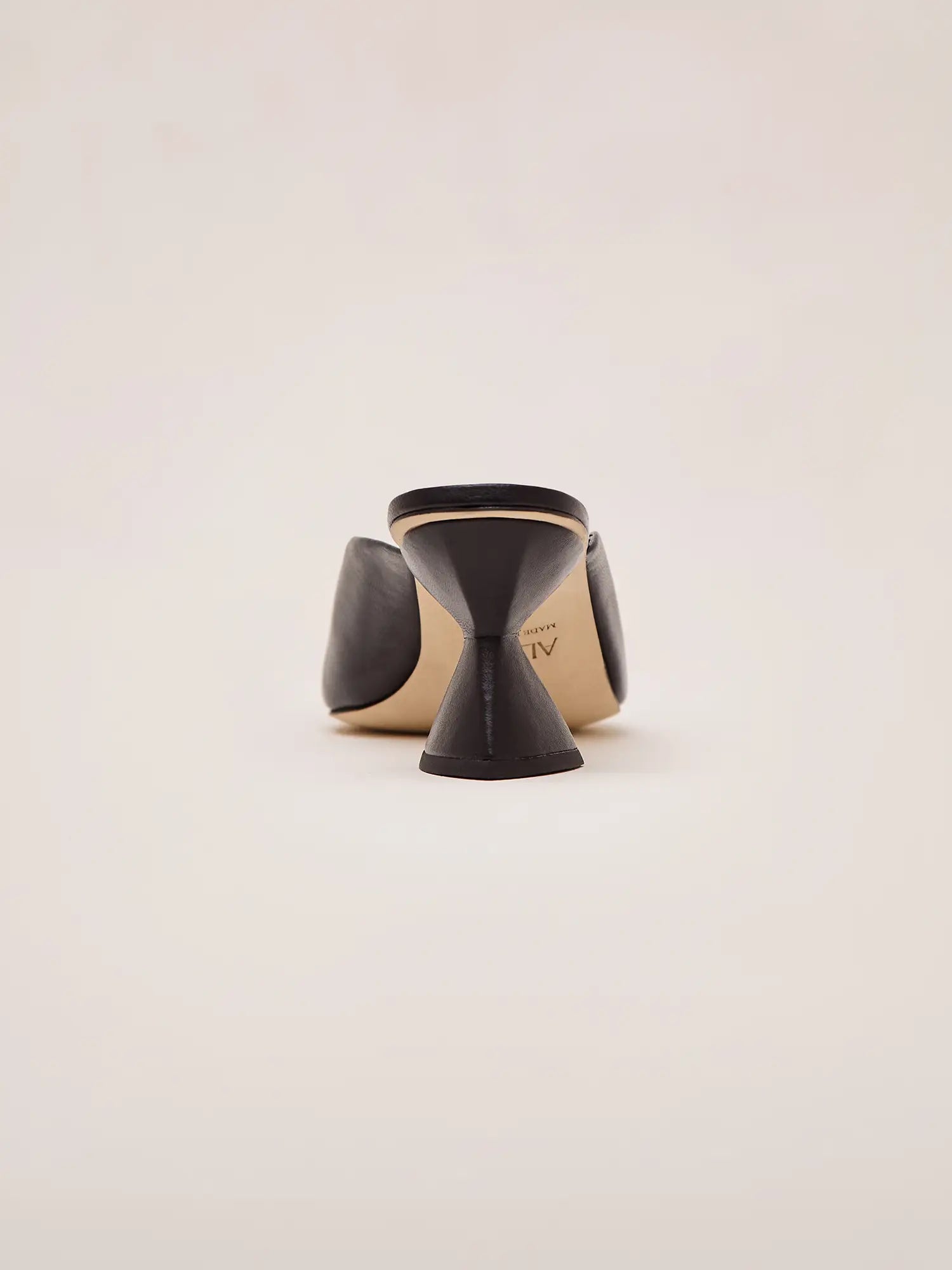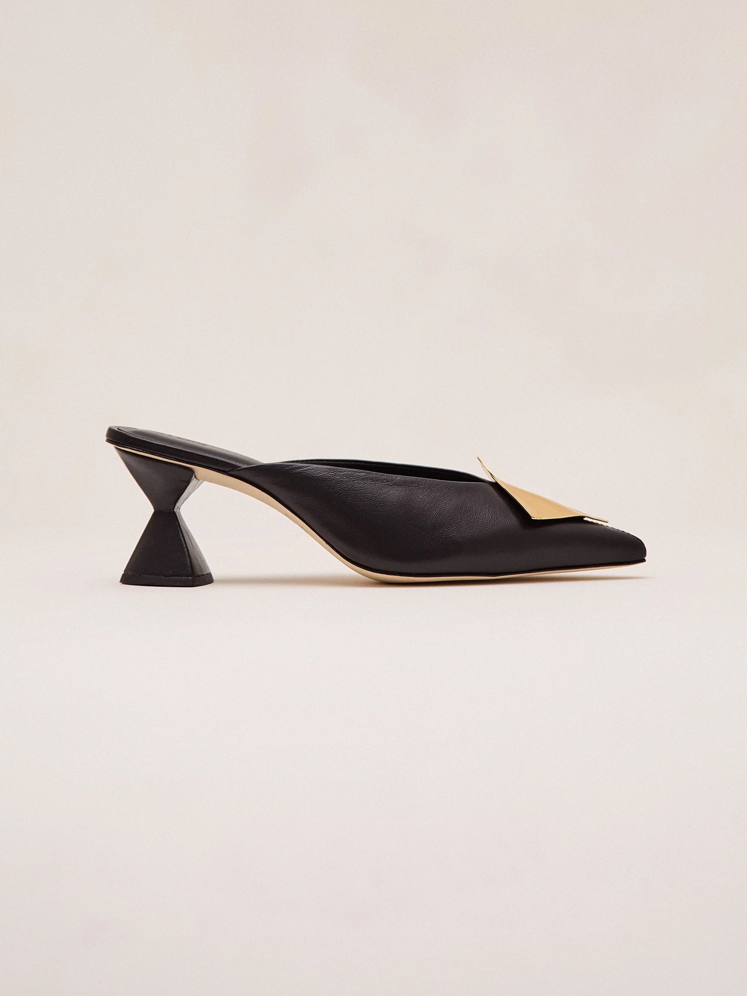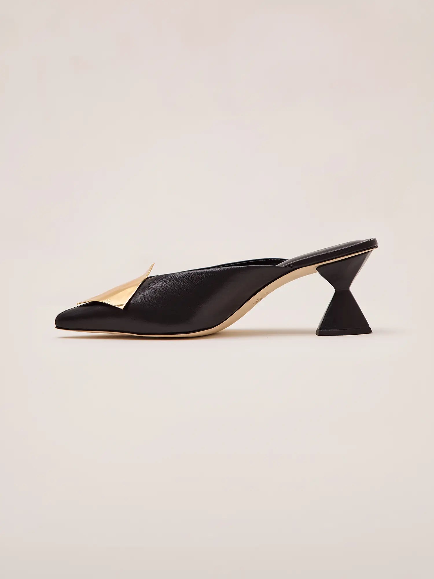 The Madeline Mule is a sleek, pointed-toe design featuring a sculptural flared heel that adds a bold, modern touch. Highlighted by a polished metal accent across the vamp.