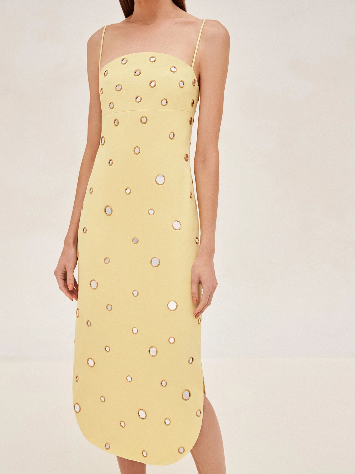Step into the Malia Cotton Midi Dress for a sleek summer look. Its yellow backdrop with subtle metallic dots adds a playful touch to the classic midi cut. Simple straps and a figure-skimming fit make it versatile for both day and evening events. Pair it with your favorite heels, and let this dress speak for itself.